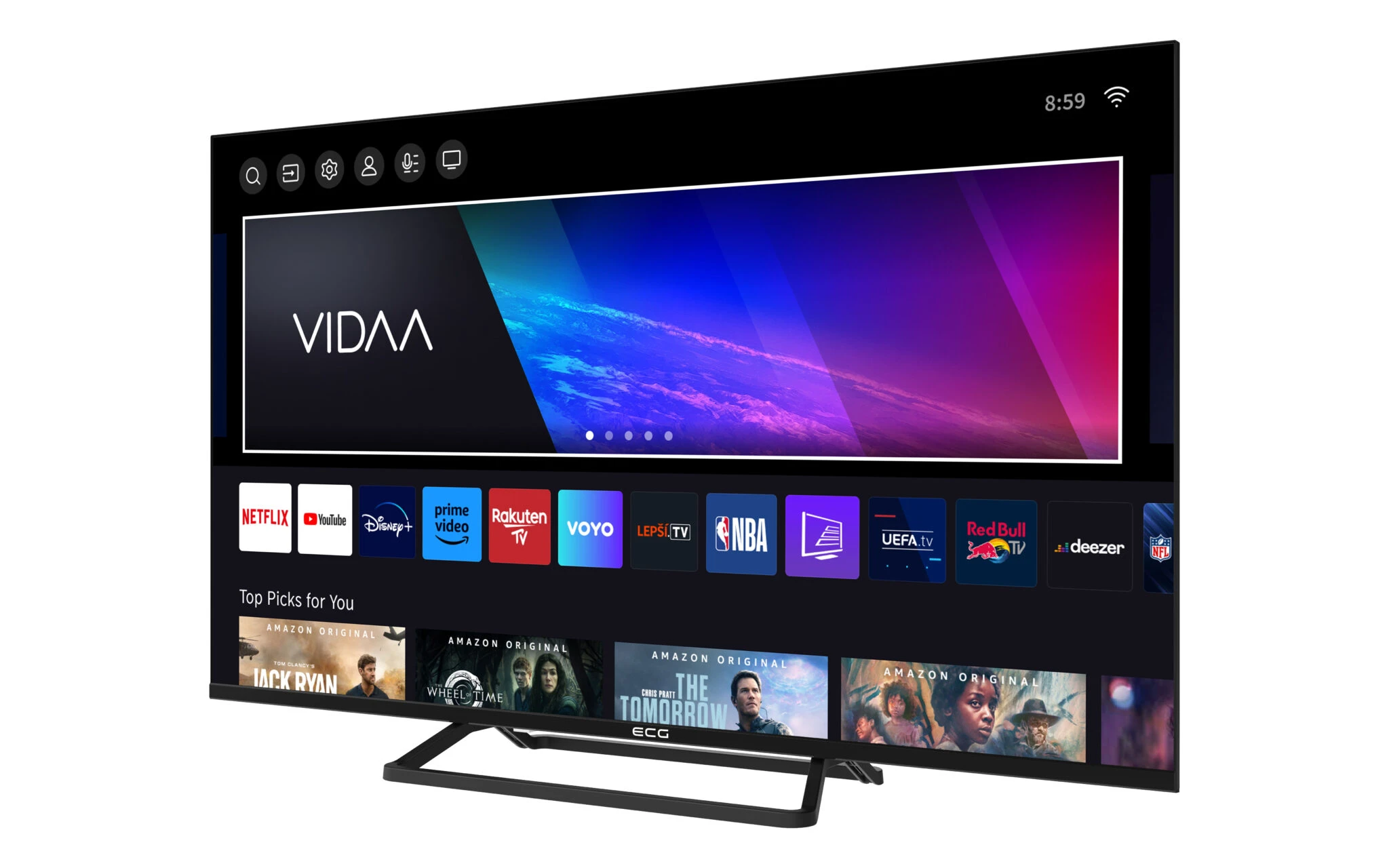Mezi vámi a nekonečnou zábavou nestojí nic v cestě. Operační systém VIDAA totiž myslí na vše, a tak má připraveno to pravé pro každého člena vaší rodiny. V jeho nabídce nechybí aplikace populárních streamovacích platforem, jako je Netflix, YouTube, Disney+ nebo třeba Amazon Prime Video – k těm hlavním máte snadný přístup i díky speciálním tlačítkům na dálkovém ovladači. Dále vás určitě potěší fakt, že je v operačním systému rovnou zabudována i možnost hlasového ovládání. A aby bylo používání TV ECG ještě pohodlnější, k operačnímu systému VIDAA je připravena i přehledná mobilní aplikace pro snadné ovládání televize telefonem.