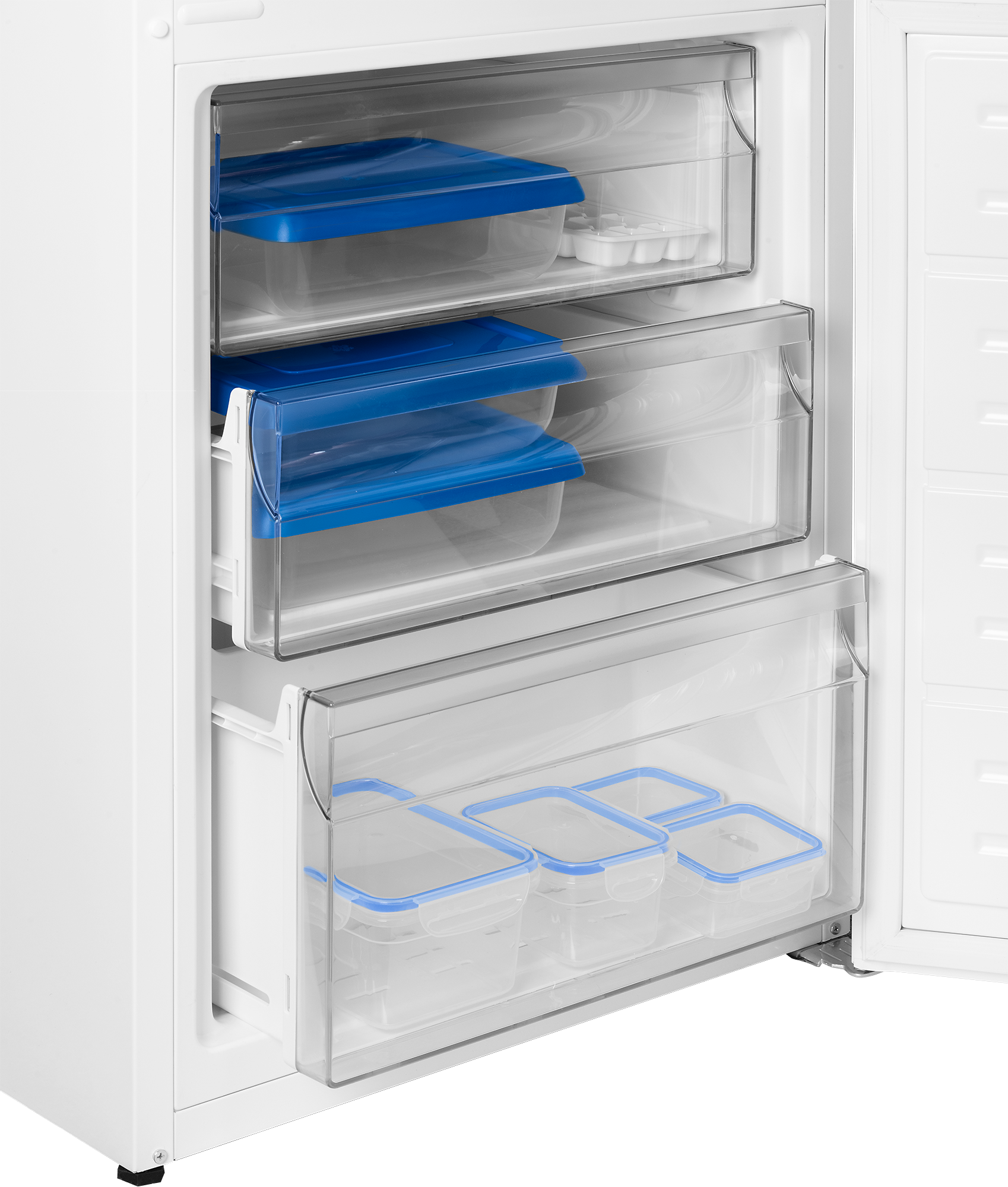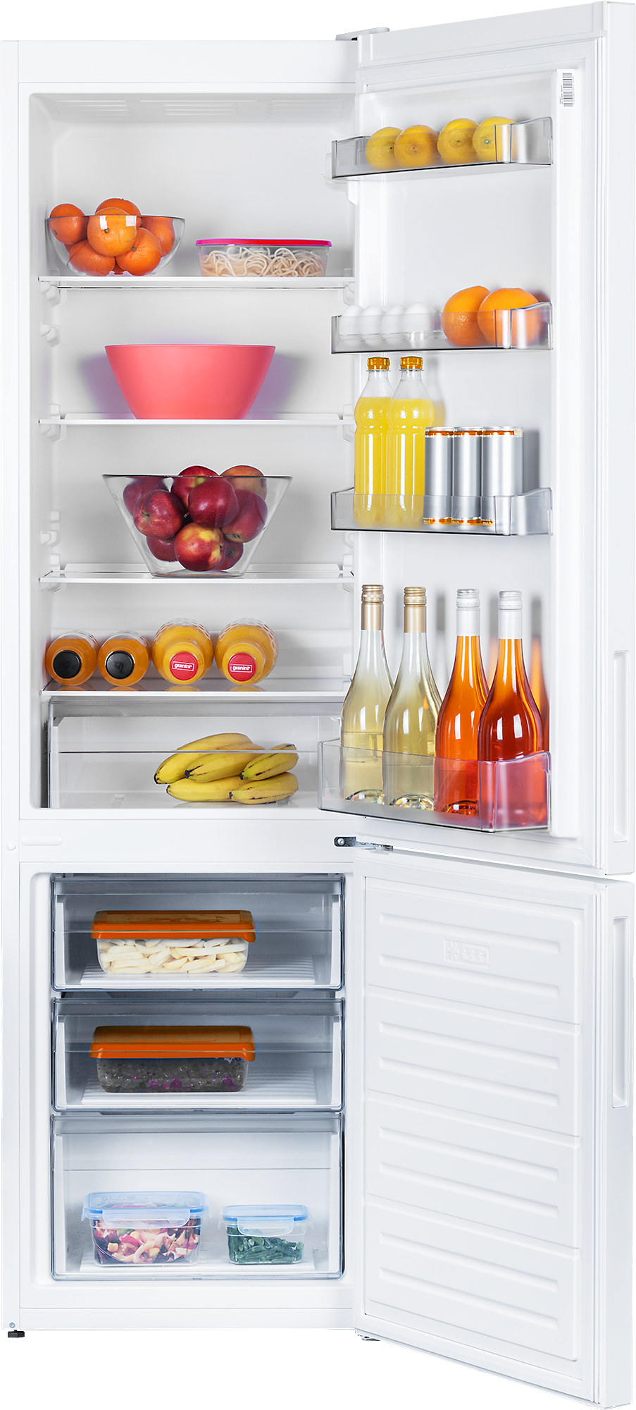 Chladnička se pyšní objemem 202 litrů a zároveň také disponuje automatickým odmrazováním. Chladicí část lednice je rozdělena pomocí čtveřice odolných polic z temperovaného skla. Díky zabudovaným drážkám můžete police jednoduše posunout a zvládnete uskladnit i větších hrnce. Ve spodní části je umístěna plastová zásuvka, která je primárně určena pro skladování ovoce a zeleniny. Na dveřích lednice jsou také umístěny čtyři police. Tři z nich slouží ke skladování menších sklenic nebo vajíček. Do nejspodnější police snadno umístíte i větší láhve.