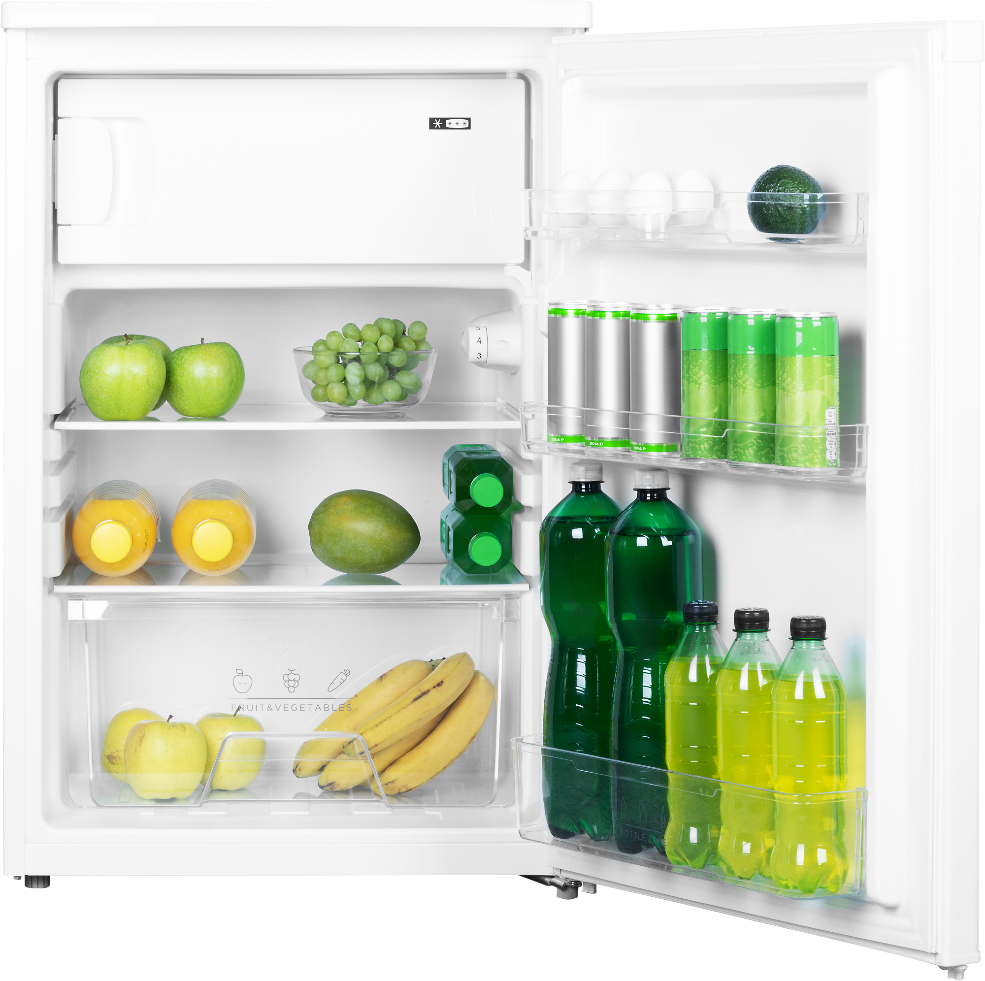 Vnitřní prostor je prakticky rozdělen 2 skleněnými policemi a nechybí zde ani transparentní zásuvka na ovoce a zeleninu. Samozřejmostí jsou také přihrádky ve dveřích, do kterých můžete postavit láhve s pitím nebo uložit drobnější potraviny. Přehled v uskladněných potravinách budete mít díky energeticky úspornému LED osvětlení. Teplotu uvnitř snadno manuálně nastavíte s pomocí otočného voliče. Mrazicí přihrádka pak poskytuje dostatek místa k uskladnění surovin, které vyžadují podmínky pod bodem mrazu. Uložíte sem nejen nanuky či pizzu, ale i maso. Teplota uvnitř mrazicí zásuvky dosahuje až -18 °C.