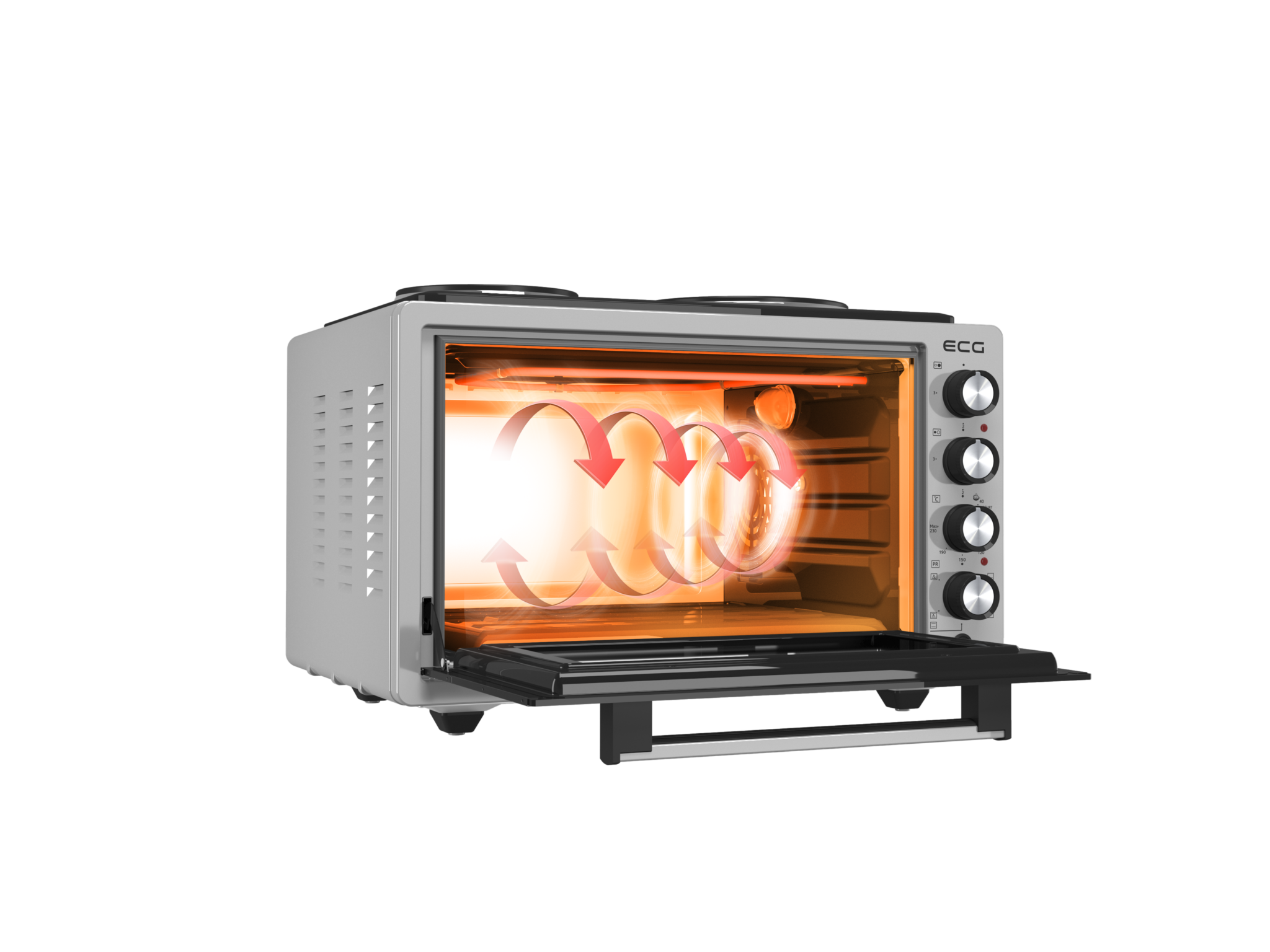 Stolní trouba s elektrickými plotýnkami ECG ETH 3701G vám skvěle poslouží v malém bytě, na chatě, v kanceláři i třeba v maloobchodní prodejně. Jde totiž o kompaktní spotřebič, s jehož pomocí se dá vařit, smažit či péct i v místech, která nejsou vybavena klasickou kuchyní. Stačí ho postavit na stůl a zapojit do klasické zásuvky – jakmile tak učiníte, můžete využívat troubu s kapacitou 37 litrů a výkonem 1300 W a také 2 elektrické varné plotýnky s 3 úrovněmi nastavení (průměr 180 mm a 145 mm, výkon 1500 W a 1000 W). Také je praktické, že zařízení umožňuje současně využívat troubu a menší plotýnku. Rozměry trouby činí 36 × 52 × 45 cm. Jedná se tedy o velmi skladnou pomůcku, jejíž zásluhou můžete chystat vynikající jídla takřka kdekoliv.