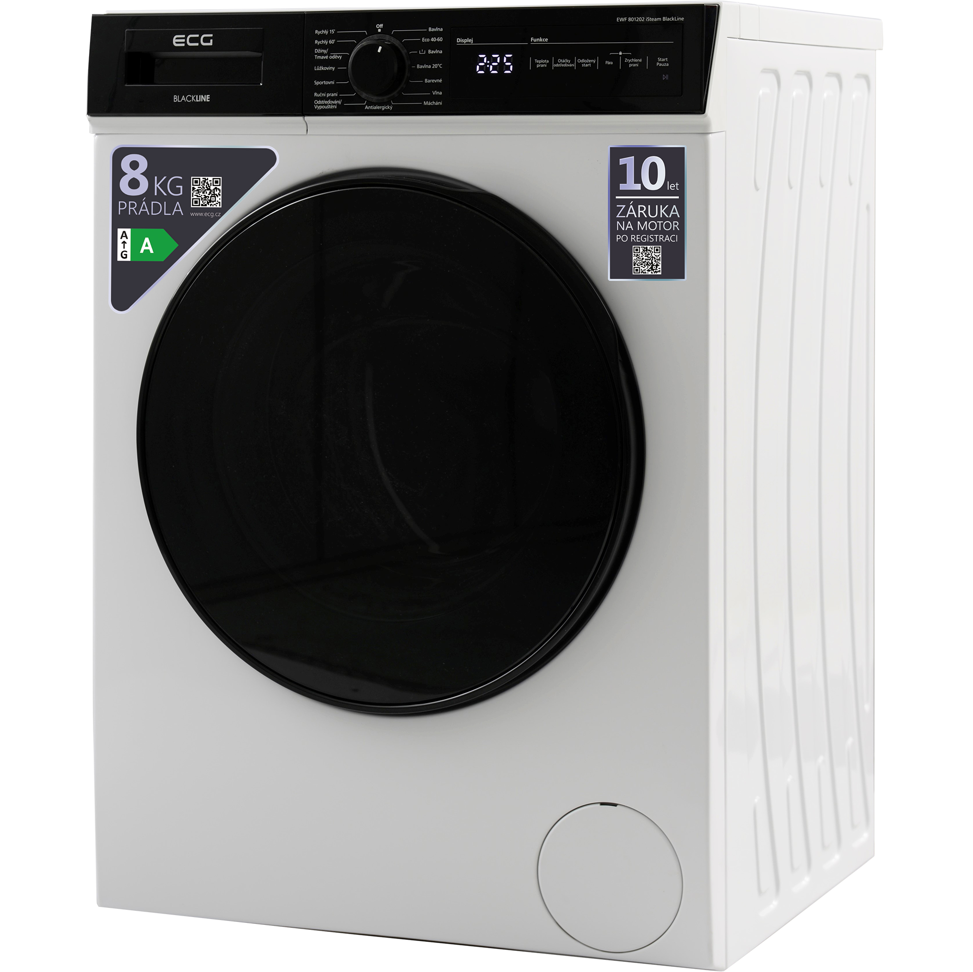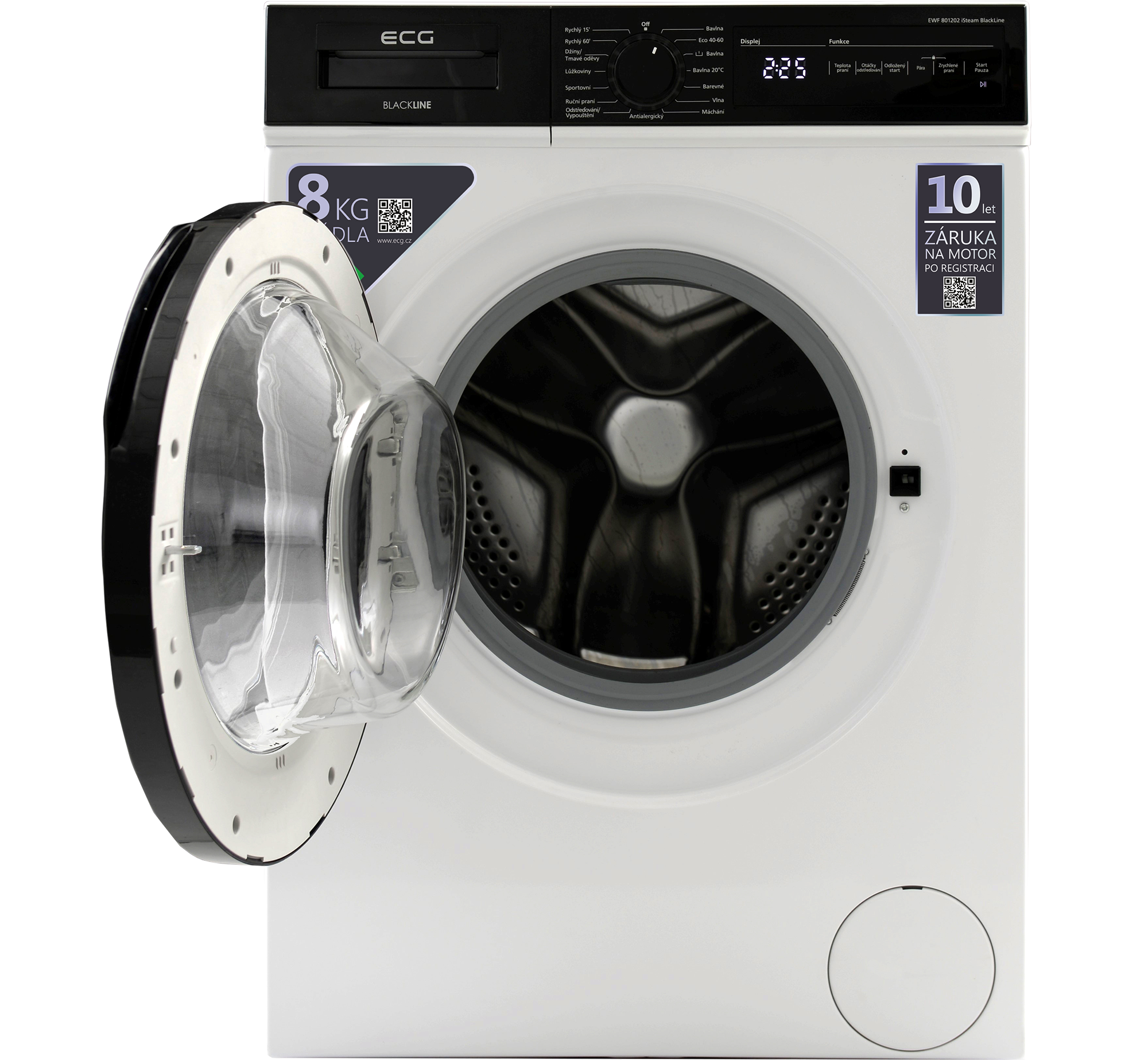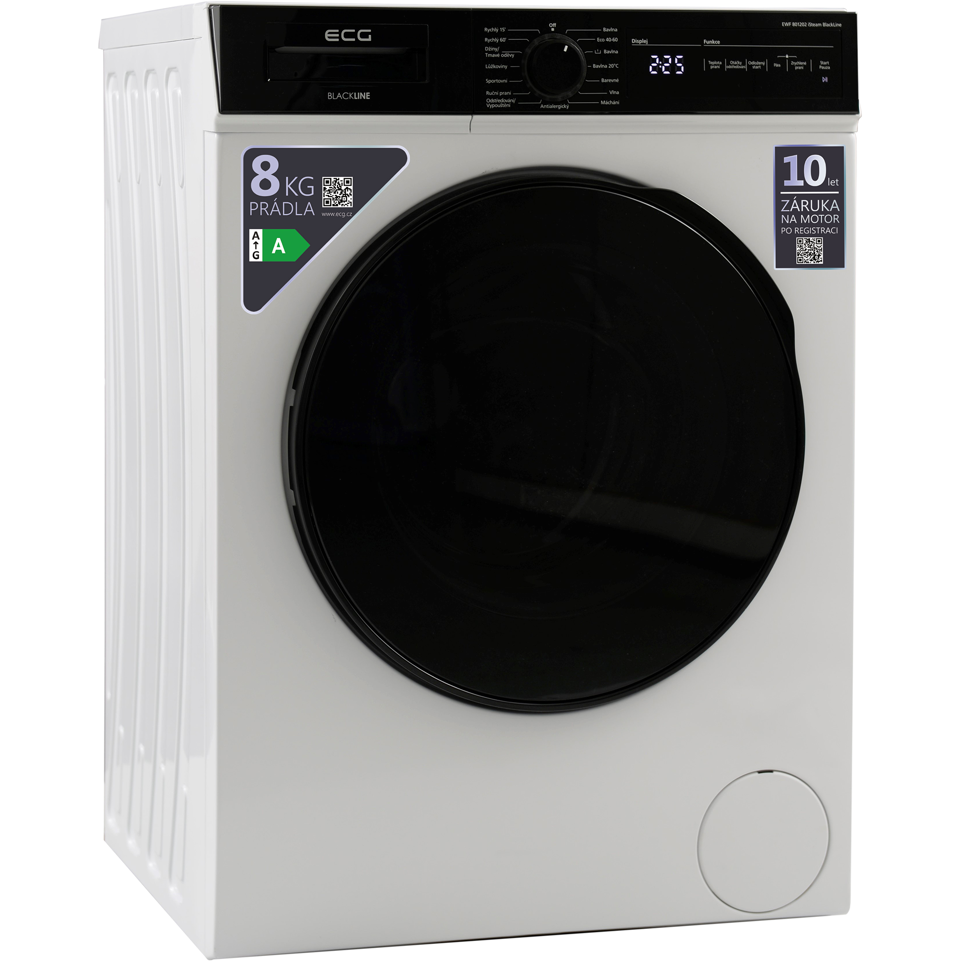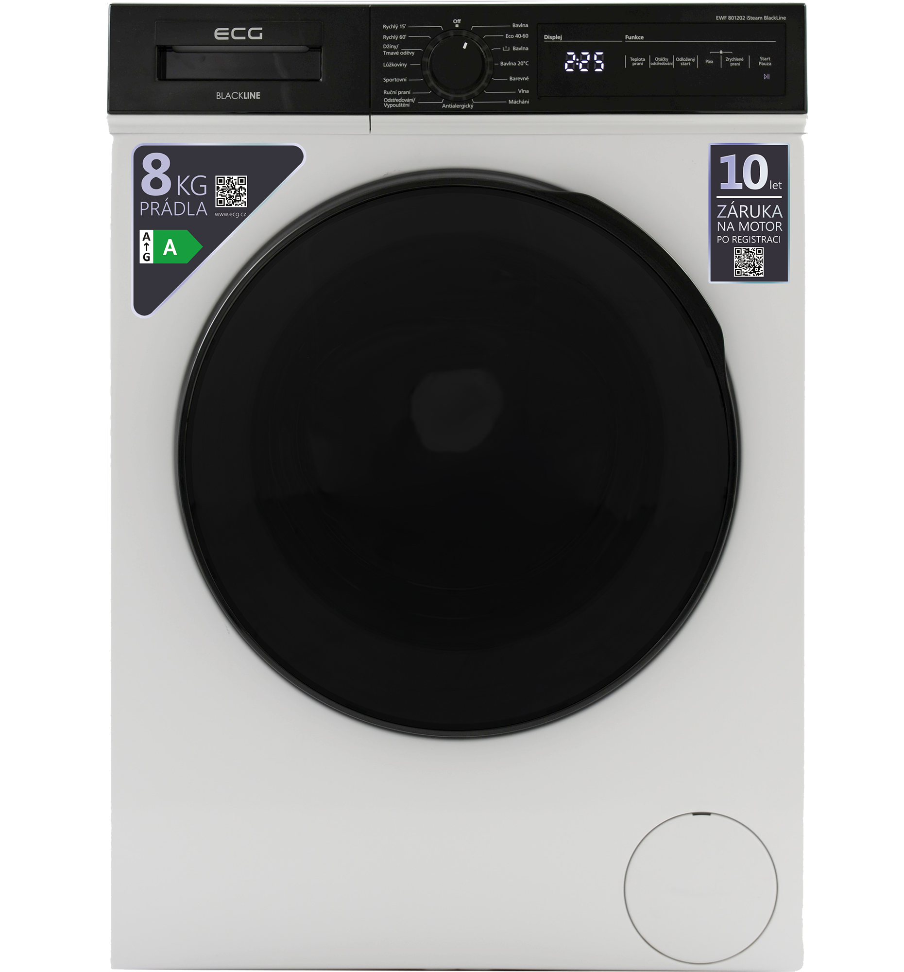 S obsluhou automatické pračky ECG EWF 801202 iSteam BlackLine si hravě poradí úplně každý. Je tomu tak zásluhou elegantního černého panelu, na němž máte k dispozici otočný ovladač pro volbu programu a k tomu ještě speciální část s digitálním displejem a dotykovým ovládáním všech nejdůležitějších funkcí. K bezproblémové obsluze pračky navíc přispívá i fakt, že popisky ovládacího panelu jsou v češtině.