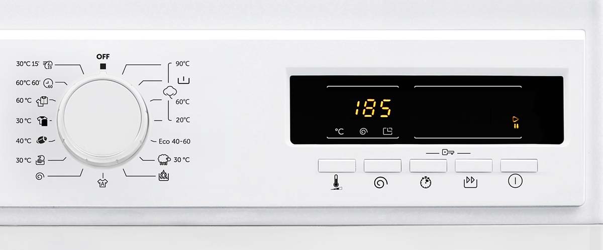 Samotné ovládání je velmi jednoduché. Tvoří ho hlavní otočný volič určený k nastavení programů a tlačítka, kterými navolíte doplňkovou funkci. Přehledný displej zobrazuje zbývající čas pracího cyklu a informuje vás o aktuálním nastavení spotřebiče.