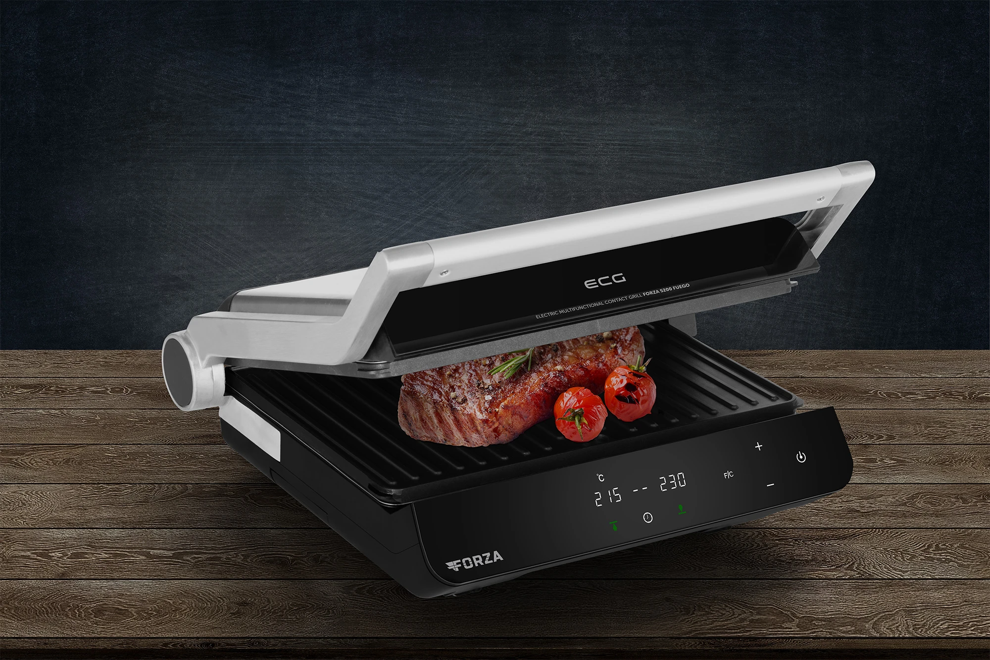 Máte chuť na dokonale ugrilované maso, šťavnaté zeleninové pokrmy nebo křupavé panini? S kontaktním grilem ECG FORZA 5200 Fuego zvládnete všechny tyto lahůdky připravit levou zadní, a to kdykoliv během roku. Tento špičkový gril se dá totiž používat v pohodlí domova, přičemž nabízí řadu funkcí a výhod. K dispozici vám dává hned 3 grilovací režimy (zapékání, grilování a BBQ) a 2 druhy pečicích ploten (žebrované plotny jsou skvělé třeba pro pečení panini, zatímco hladké plotny jsou perfektní na restování zeleniny či mořských plodů) s pohodlým magnetickým uchycením desek. V balení najdete i teploměr na maso s funkcí kuchyňské minutky, s nímž máte dokonalou kontrolu nad tím, jestli je váš steak propečený přesně podle vašich představ. Tak vzhůru za kulinářskými zážitky, které nebudou mít jedinou chybičku!