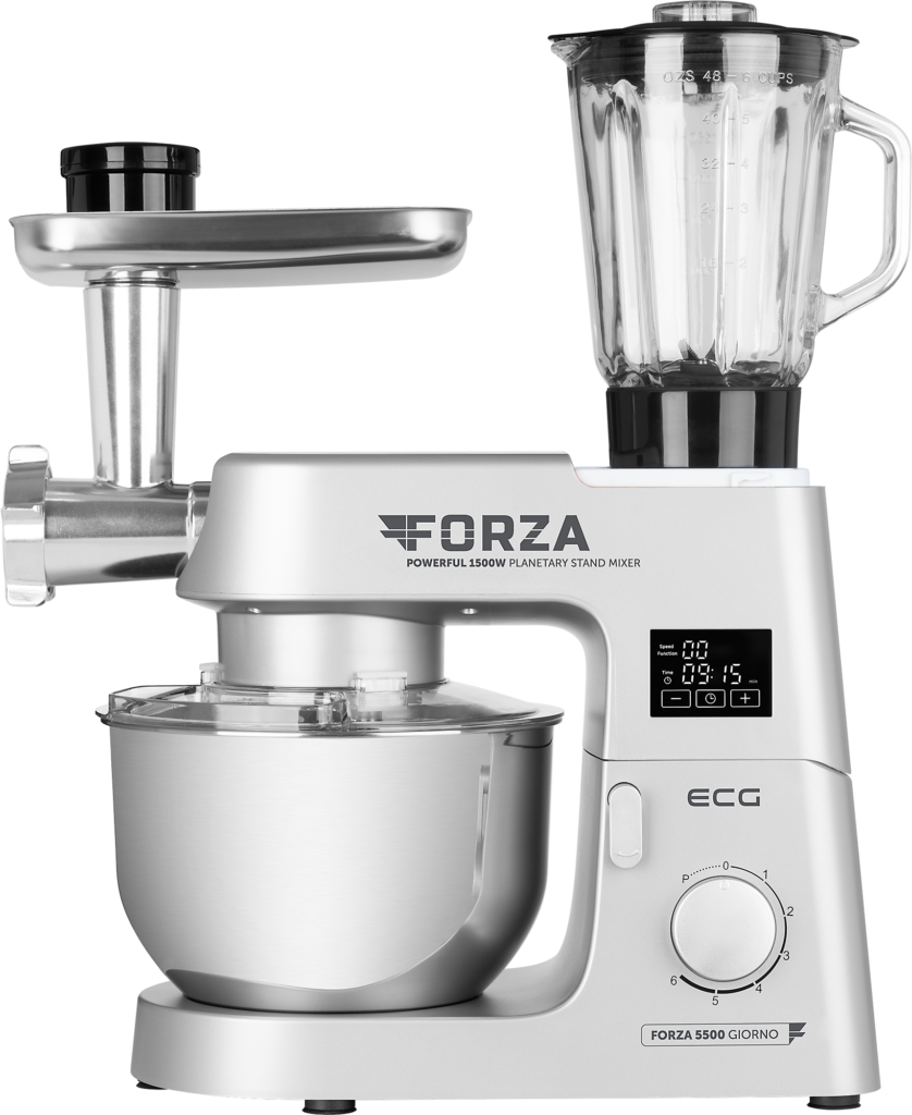 Kuchyňský robot ECG Forza 5500 Giorno vám pomůže s mnoha různými činnostmi. Jeho výbava je totiž opravdu bohatá. Posuďte sami: využívat můžete míchací hák na těsto, šlehací hák i šlehací metlu z nerezové oceli. Také máte k dispozici mlýnek na maso se 3 vyměnitelnými disky pro mletí různých druhů masa, bubnové struhadlo nebo speciální tvořítko na cukroví či sušenky. A samozřejmě nesmí chybět ani klasický mixér s kvalitními čepelemi z nerezové oceli a skleněnou nádobou (o objemu 1,5 l).