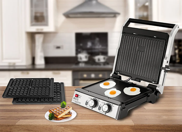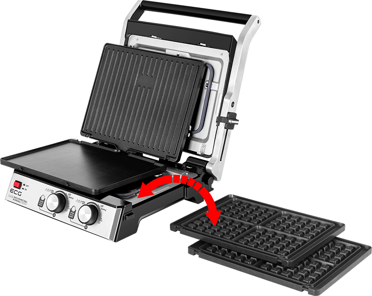 Kontaktní gril ECG je dokonale přizpůsoben požadavkům všech uživatelů. Nastavit na něm totiž můžete hned 4 pracovní pozice určené pro grilování, kontaktní a bezkontaktní zapékání a pro otevřené BBQ grilování. Kromě oboustranných desek s profilovanou a hladkou stranou navíc jako bonus najdete v balení i sadu 2 pečicích desek, které jsou určené pro přípravu vaflí.