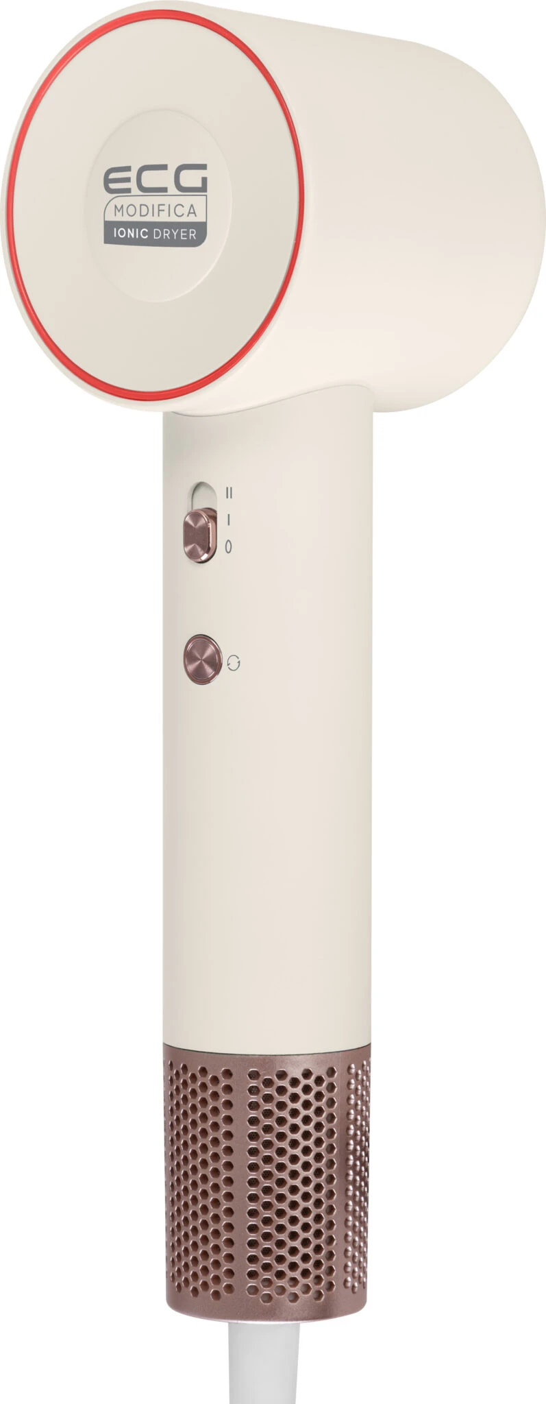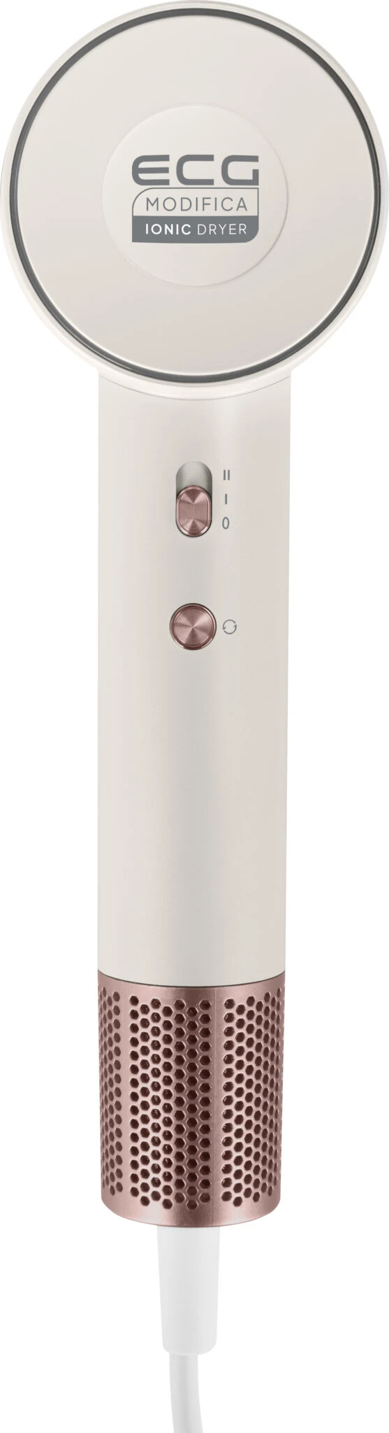 Na vysoušeči vlasů ECG Modifica Sonica si zamilujete i promyšlený design, který je nejen elegantní, ale i praktický. Fén je vyveden ve stylové povrchové úpravě, která je navíc velmi příjemná na dotek. Má populární kladívkový tvar, díky němuž je jeho používání za všech okolností pohodlné a bezproblémové. Sonica je v ruce velmi příjemný a se svým půl kilem váhy se s ním výborně manipuluje. A v neposlední řadě vás potěší stylovým kruhovým indikátorem, který vám dává pomocí barevného podsvícení vědět o tom, s jakou teplotou přístroj momentálně pracuje. Ovládání fénu zvládnete levou zadní, neboť je velmi intuitivní a má pouze 2 přepínače.