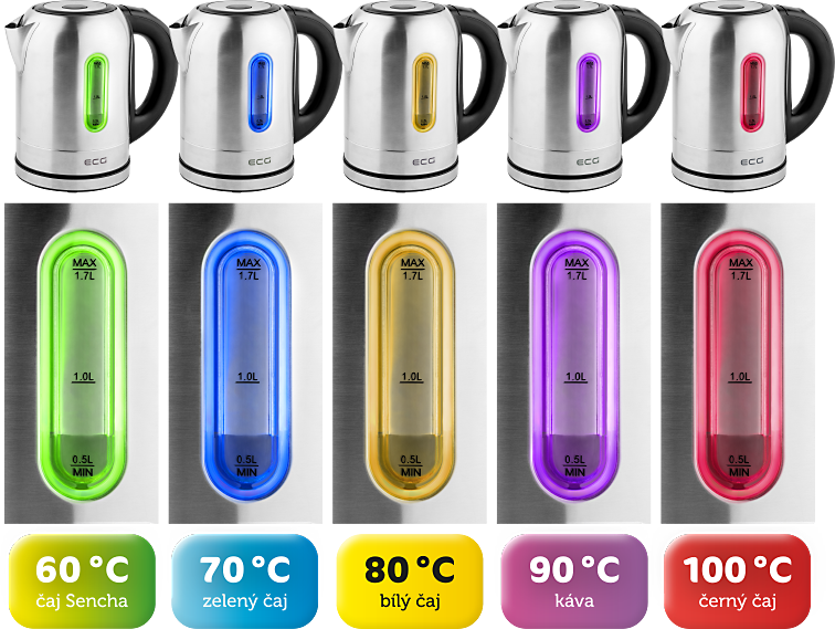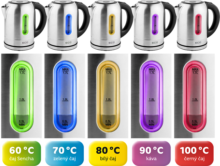 ECG RK 1785 Colore je rychlovarná konvice v moderním nerezovém provedení s objemem 1,7 l. Kromě velké kapacity se může pochlubit i velice slušným výkonem, který dosahuje na hodnotu 2000 W – díky tomu se svých horkých nápojů dočkáte během krátké chvilky. Každý nápoj však vyžaduje jiný způsob přípravy, proto zejména milovníci kvalitního čaje jistě uvítají funkci pro nastavení přesné teploty vody.
