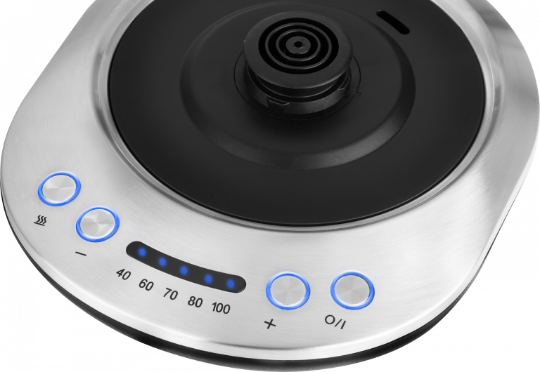 Skutečnou dominantou základny je přehledný, modře podsvícený ovládací panel. Tlačítky plus a minus snadno navolíte požadovanou teplotu. Aktuální teplotní nastavení zobrazují příslušné světelné indikátory. Nechybí zde ani tlačítka pro zapnutí konvice nebo pro aktivaci funkce udržování teploty.
