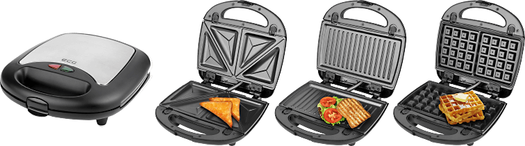Sendvičovač ECG S 299 3in1 se může pochlubit celkem 3 vyměnitelnými deskami. Jednotlivé desky jsou vyrobeny z nepřilnavého materiálu. Nedochází tak k nežádoucímu připalování zbytků jídel a také následné čištění je mnohem rychlejší. Při spuštění spotřebiče se automaticky rozsvítí červená kontrolka provozu. Na dostatečné nahřátí vás následně upozorní zelený indikátor provozu. Příkon dosahuje hodnoty 700 W.