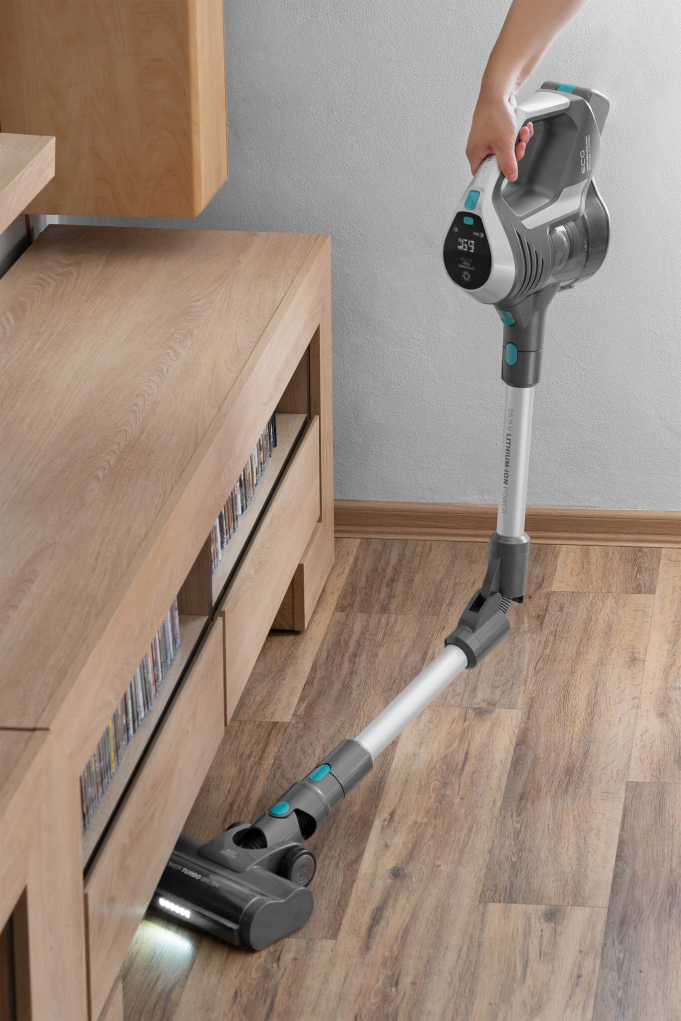 Jednou z výrazných předností tohoto aku vysavače je také ohebná kovová trubice. Ta vám totiž umožní pohodlně vysávat i pod nízkým nábytkem, postelemi nebo gaučem – bez nutnosti namáhavého ohýbání. Díky motorizovanému kartáči s LED osvětlením vysávané plochy se navíc snadno dostanete i do tmavých rohů a zákoutí, kde často zůstávají nečistoty neodhalené.