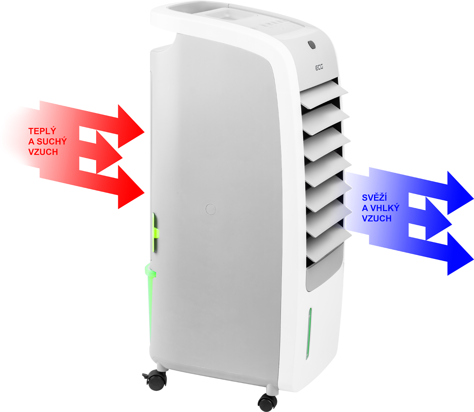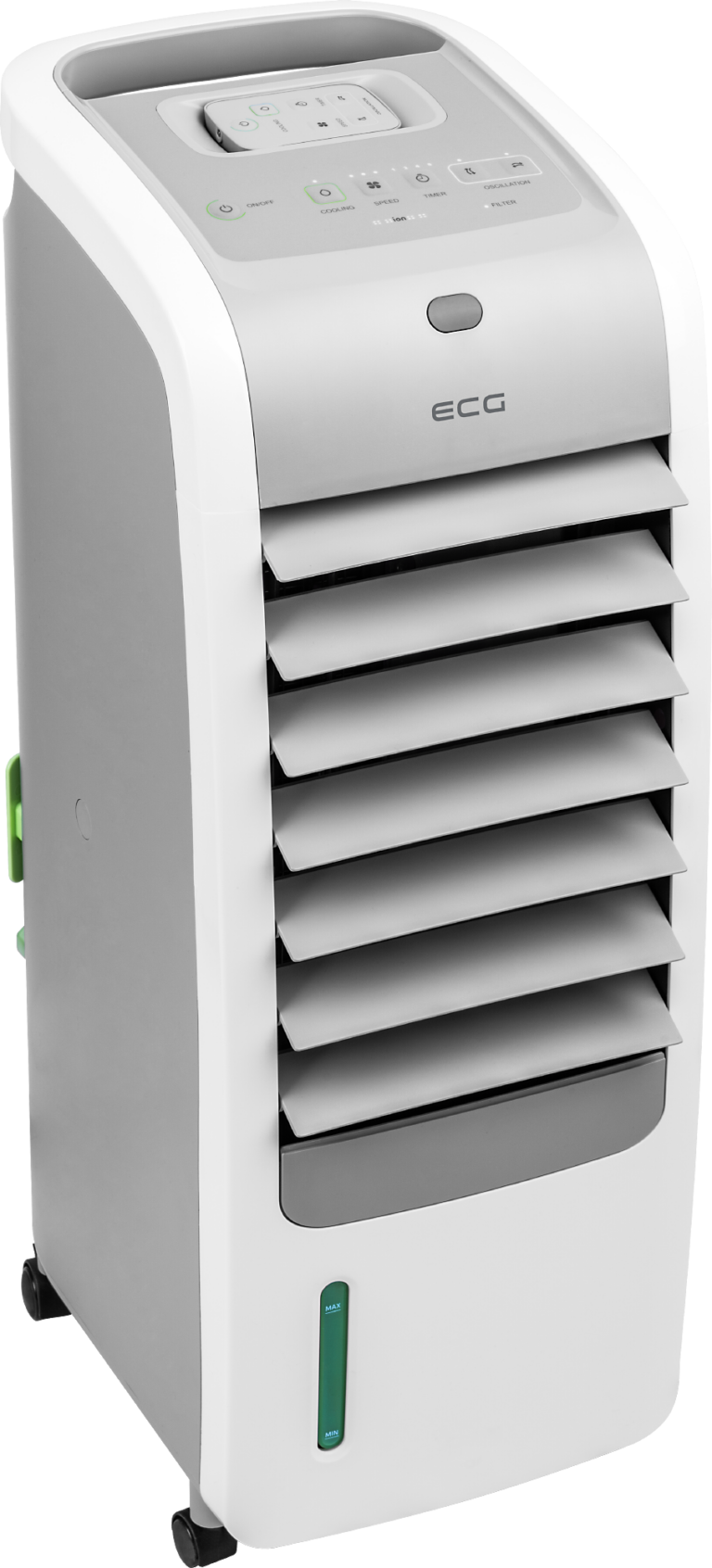 Das meistgenutzte Gerät in tschechischen Haushalten während der Sommertage ist zweifellos der Ventilator. Im Falle des Luftkühlers ECG ACR 5570 ist dies nur eine von vier Funktionen. Dies bedeutet jedoch nicht, dass der Ventilator weniger effizient ist, ganz im Gegenteil. Er verfügt über vertikale und horizontale Schwingungen. Die Geschwindigkeit des Luftstroms kann je nach Bedarf auf 3 Geschwindigkeiten, niedrig, mittel oder hoch, eingestellt werden.
