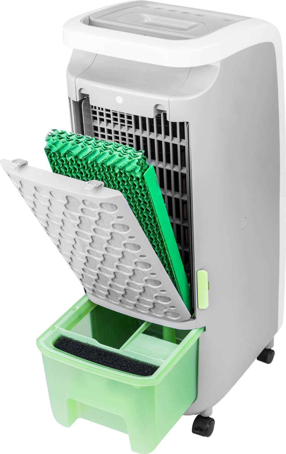Der Luftkühler ECG ACR 5570 ist mit einer doppelten Filtration ausgestattet. Auch der Staubfilter ist abnehmbar und leicht zu waschen. Nach 100 Betriebsstunden weist Sie das Gerät mit einem Lichtsignal auf die Reinigung des Filters hin.
