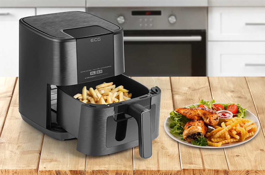 Sie lieben knusprige Pommes, Kroketten oder vielleicht perfekt gewürzte Hähnchenkeulen, haben aber Angst davor, wie ungesund all diese Lebensmittel sind? Dann möchten wir Ihnen die Heißluftfritteuse ECG AF 5500 Crunchy vorstellen, mit der Sie alle oben genannten Gerichte (und viele weitere) ganz einfach und in deutlich gesünderer Form zubereiten können. Dank des modernen Heißluft-Schnellzirkulationssystems schmelzen die Zutaten nicht im Fett – Sie können sie mit nur wenigen Tropfen Öl oder sogar ganz ohne in köstliche Köstlichkeiten verwandeln. Dank der Technologie unserer Heißluftfritteuse ist die Zubereitung Ihrer Lieblingsgerichte nicht nur gesünder, sondern auch schneller und nicht zuletzt energieeffizienter.
