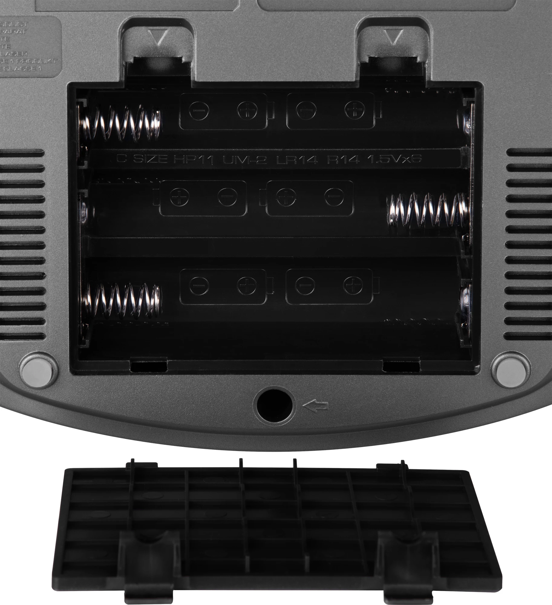 Der Vorteil dieses modernen Radios liegt in der Möglichkeit, Energie aus zwei Quellen zu beziehen. Zu Hause können Sie bequem ein Netzteil (AC 100–240 V) verwenden. Wenn Sie jedoch in der Hütte, im Garten oder beim Picknick unterwegs sind, legen Sie einfach sechs Batterien vom Typ C ein und genießen Sie Musik auch ohne Steckdose. Gleichzeitig sorgen der energiesparende Betrieb mit einem Stromverbrauch von 16 W und die automatische Standby-Funktion für einen stets sparsamen Energieverbrauch.