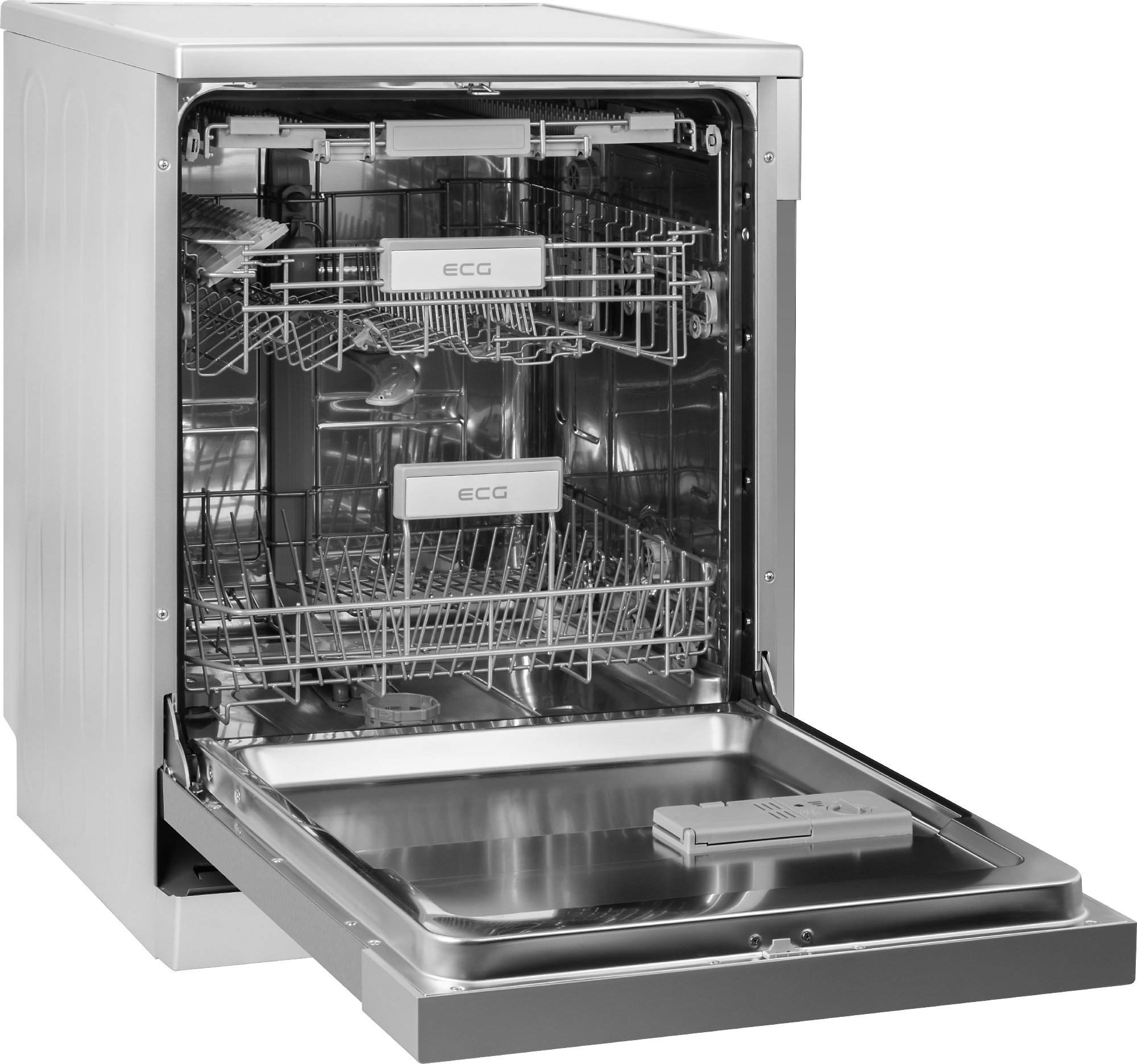 Der Geschirrspüler ECG EDF 6066 QXD hat besonders raffinierte Schubladen. Die Besteckschublade ist teleskopisch verstellbar. Im hinteren Teil der unteren Schublade befinden sich aufklappbare Dornen. In der obersten Schublade sind diese Dornen sogar in der ganzen Schublade. Im linken Bereich befinden sich außerdem zwei abnehmbare ½-Becherhalter für Gläser, Tassen oder Weingläser. Mit der Funktion Easy Fold lässt sich die Höhe des gefüllten Oberkorbs einfach einstellen.