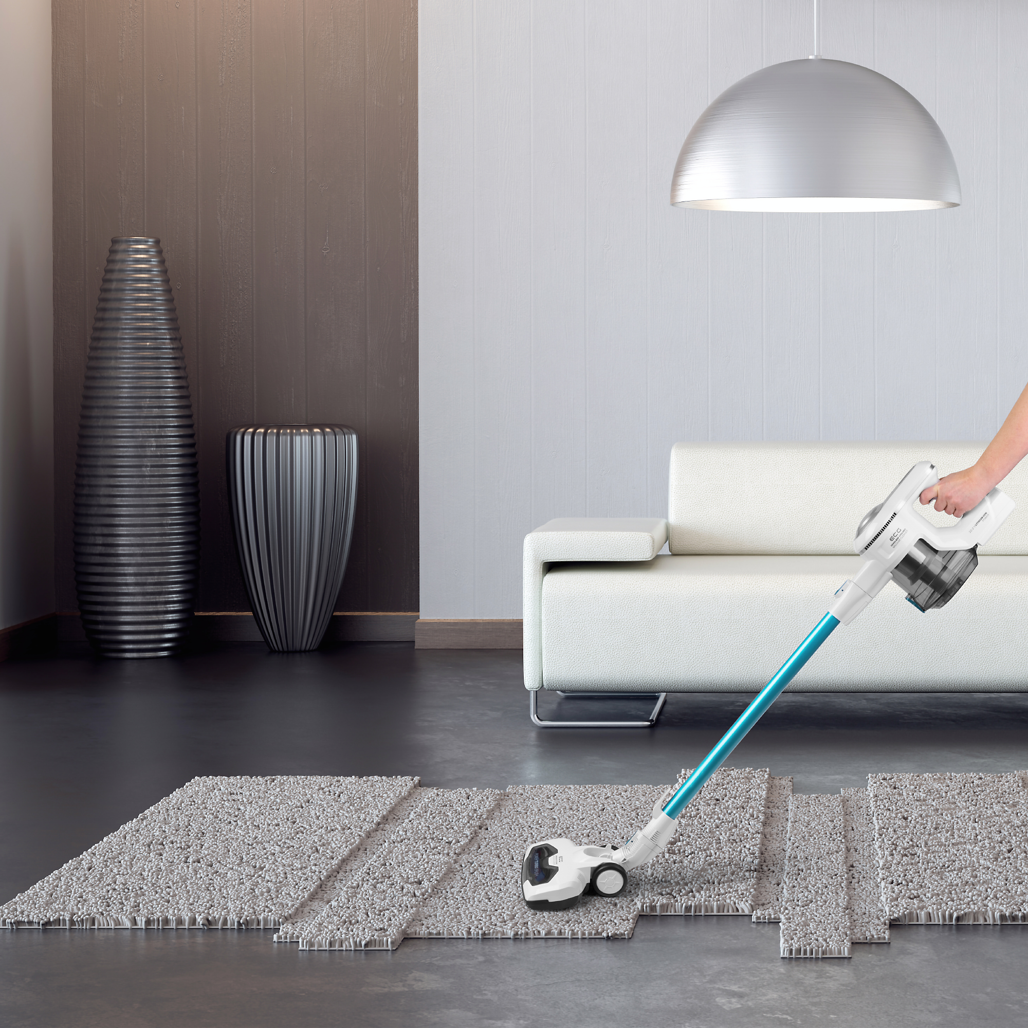Damit Sie während der Reinigung kein Kabel hinter sich herziehen (und es in verschiedene Steckdosen anschließen) müssen, kann unser Akku-Staubsauger mit einem leistungsstarken Li-Ion-Akku betrieben werden. Nach dem vollständigen Aufladen können Sie ihn bis zu 40 Minuten benutzen.
