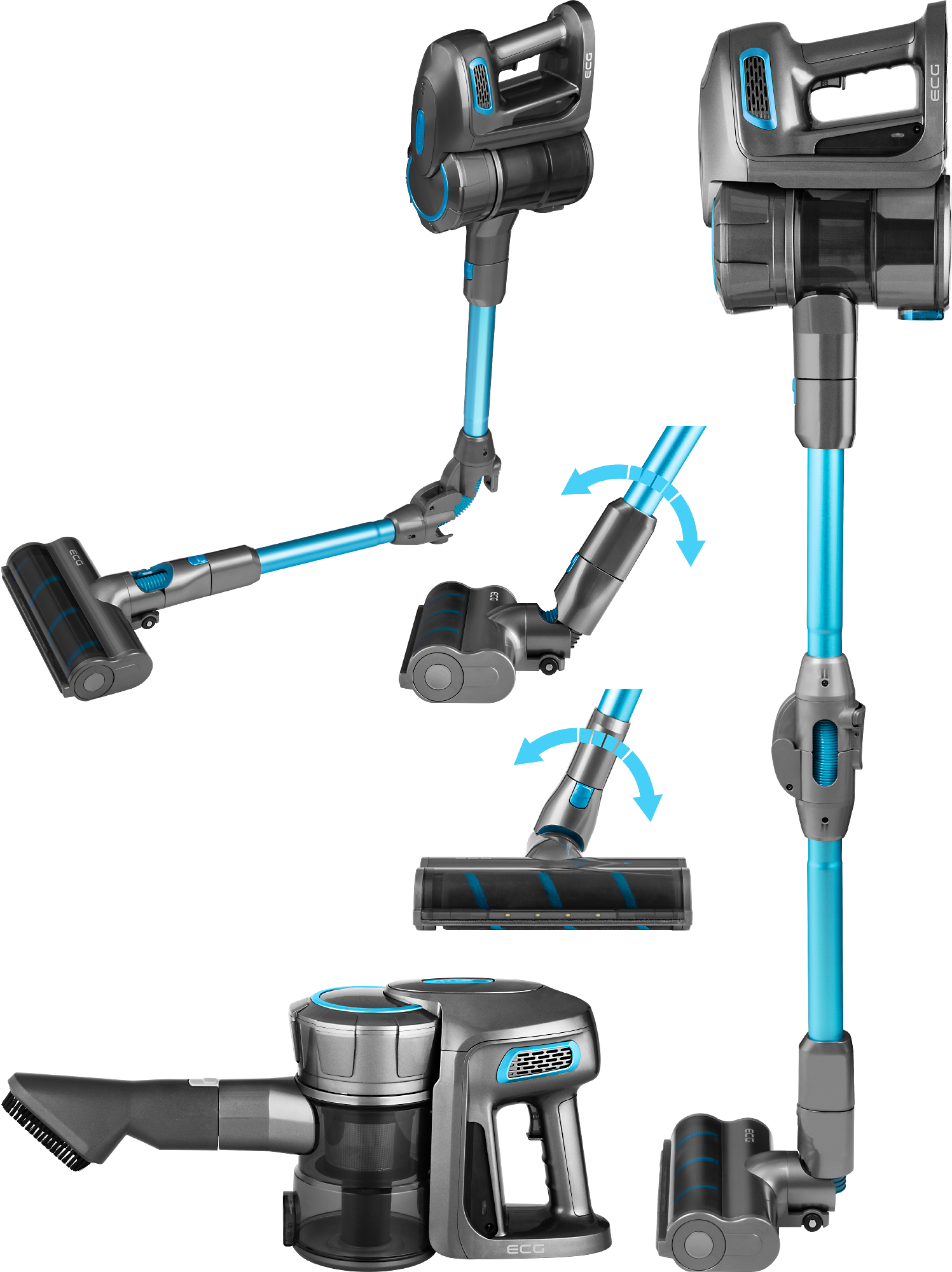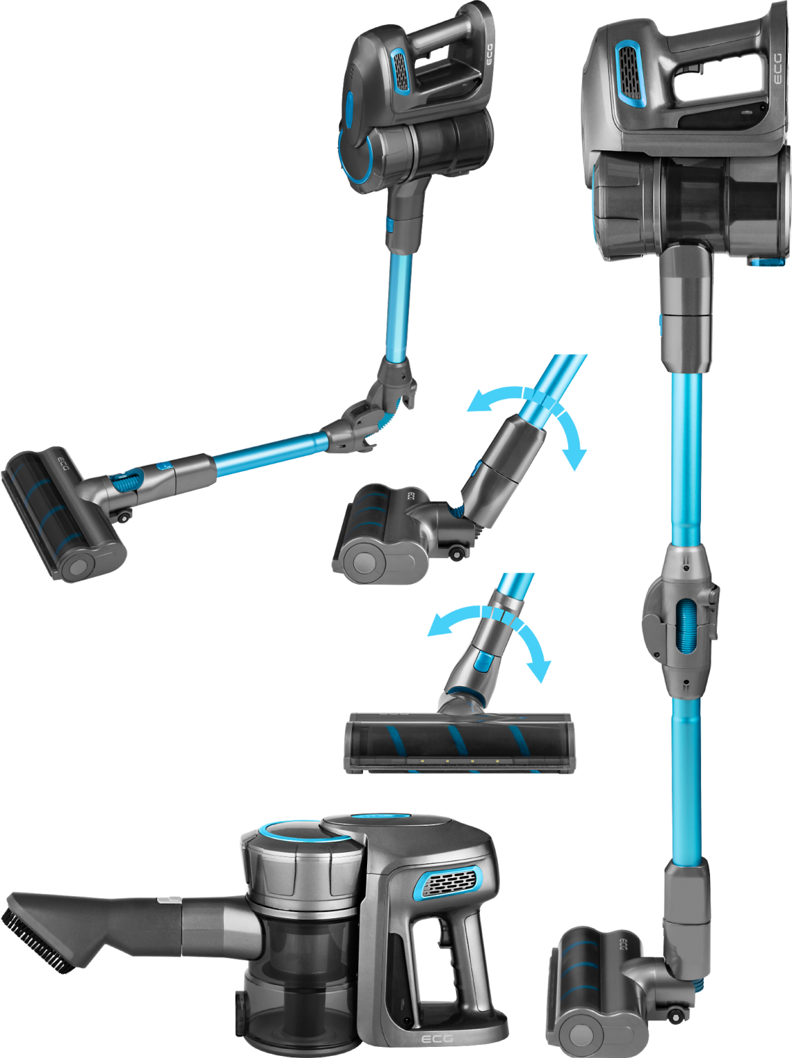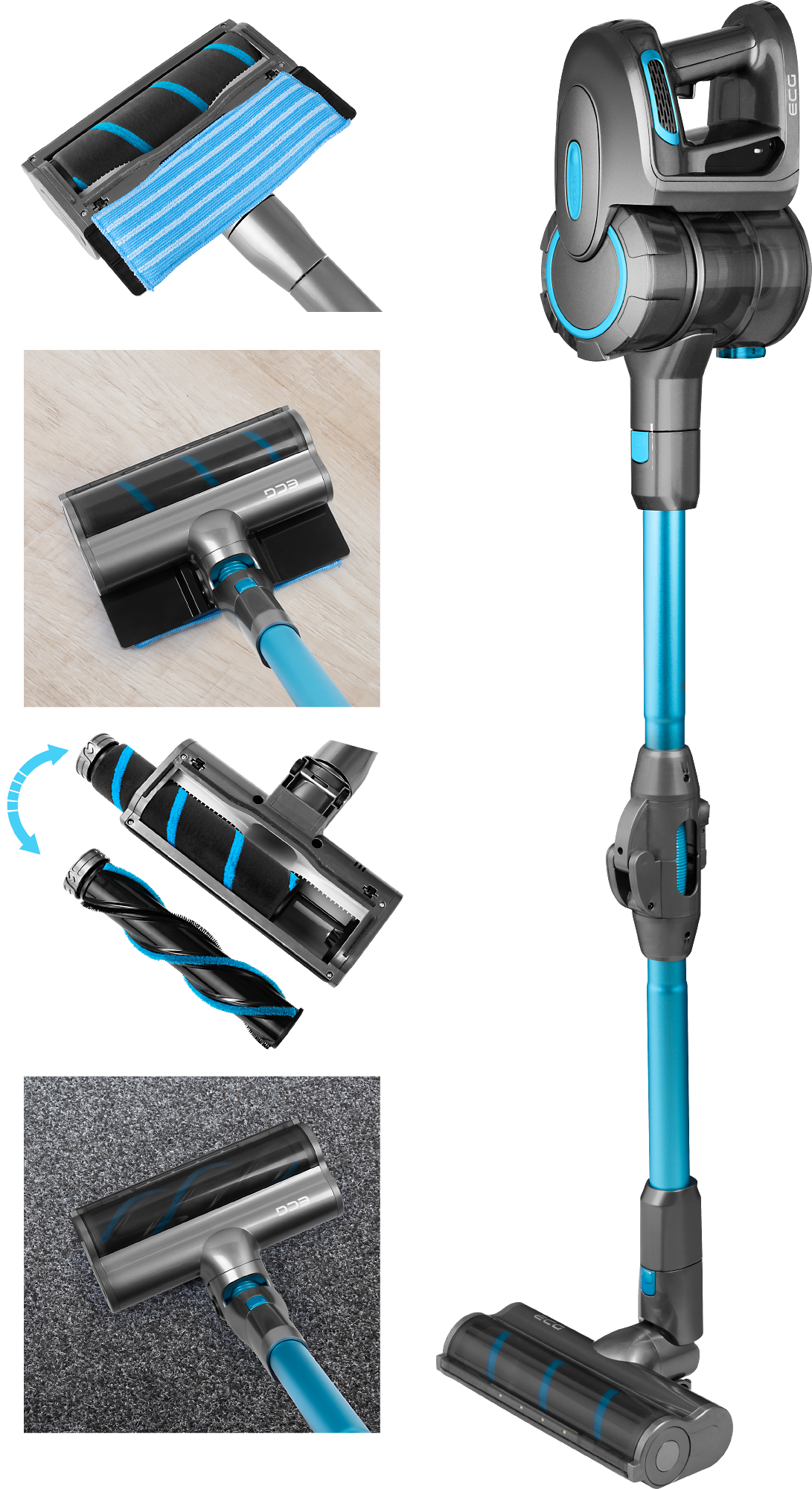 Der Staubsauger ECG VT 6220 2in1 Power Flex wird mit einer Reihe von praktischem Zubehör geliefert, um Ihren gesamten Haushalt präzise zu reinigen. Die Bodendüse hat austauschbare Bürsten, so dass Sie zwischen einer Teppichbürste und einer Hartbodenbürste wählen können. Das flexible Gelenk des Akku-Staubsaugers ermöglicht eine einfache Handhabung und den Zugang zu schwer zugänglichen Stellen. Der Staubsauger ist außerdem mit einem Wischmopp zum Abwischen und einer Staubbürste ausgestattet. Wenn Sie mit der Reinigung fertig sind, stellen Sie den Staubsauger einfach an einem beliebigen Ort ab oder hängen Sie ihn an die Wand, denn das Netzgerät hat ein ausreichend langes Kabel.