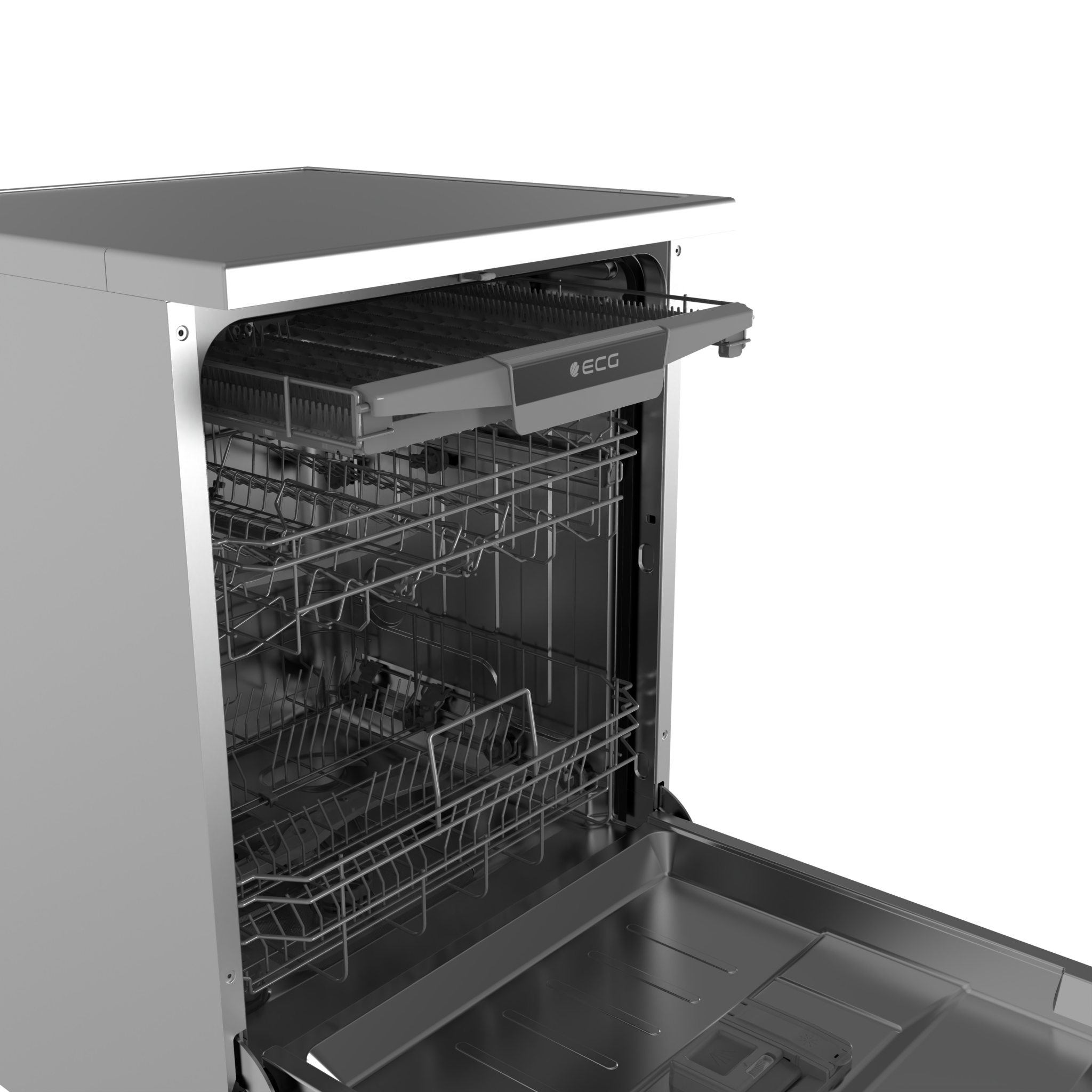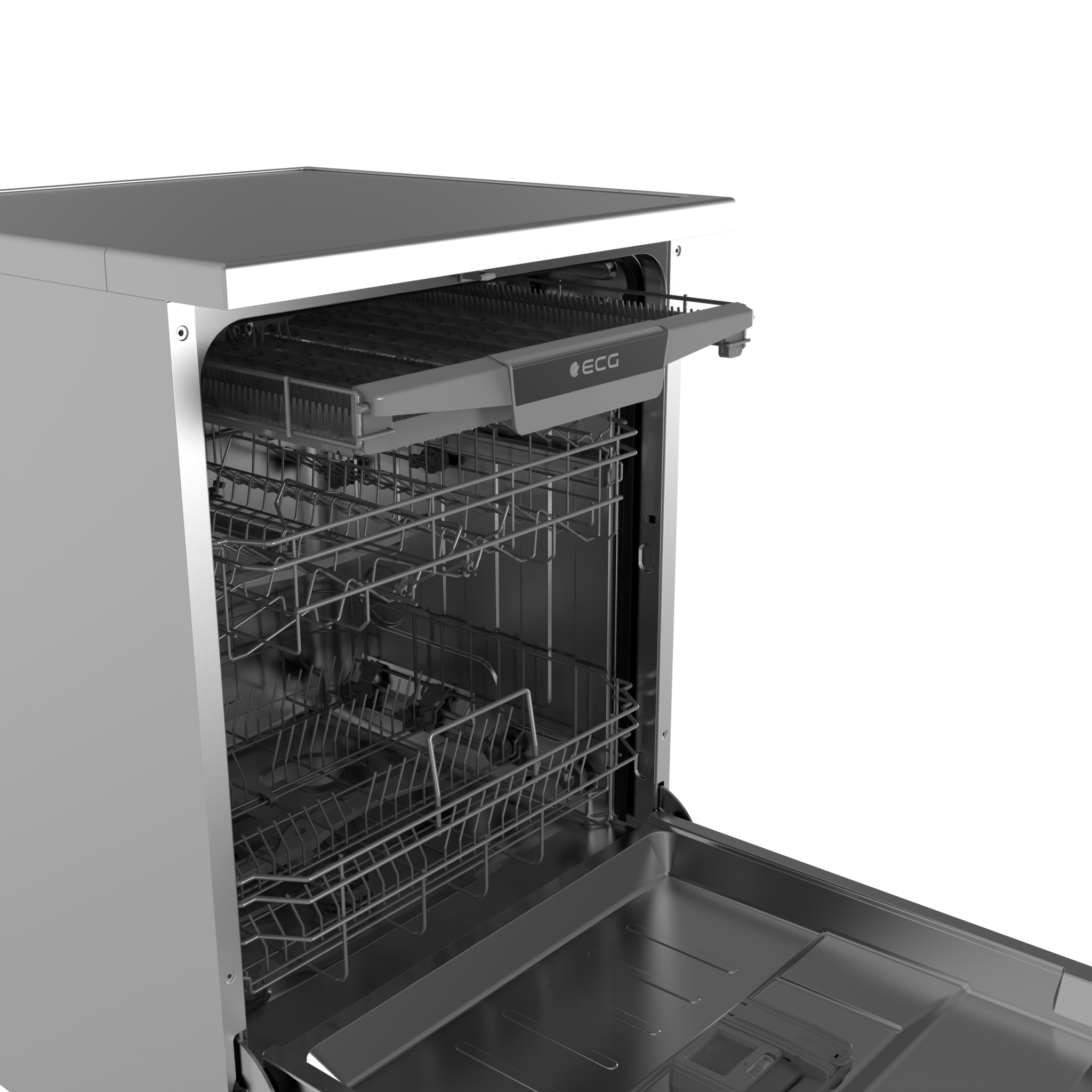 The Aquastop system provides the ECG EDS 300763 BlackLine dishwasher with reliable protection against overheating. A child lock protects the appliance from unauthorized use. The dishwasher's equipment also includes useful salt and rinse aid indicators, which alert you in time to the need for refilling.