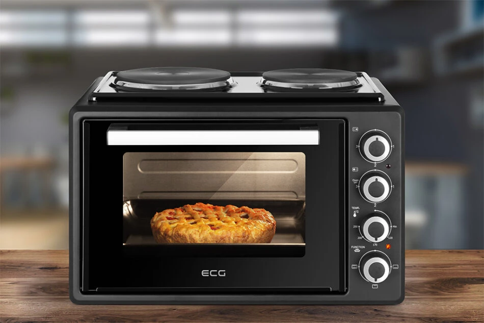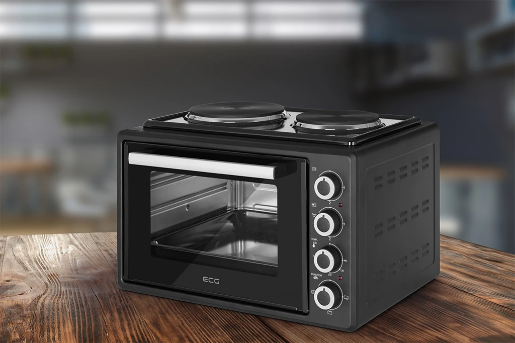 The tabletop oven with hotplates ECG ETH 3501B will please you with its high-quality glossy black metal design. The interior space is galvanized. The oven doors are equipped with double glass and three-phase opening for safer and more convenient handling. And there is also integrated lighting inside the oven, providing you with a great view of the dishes being prepared. Regular cleaning will contribute to extending the appliance's lifespan.