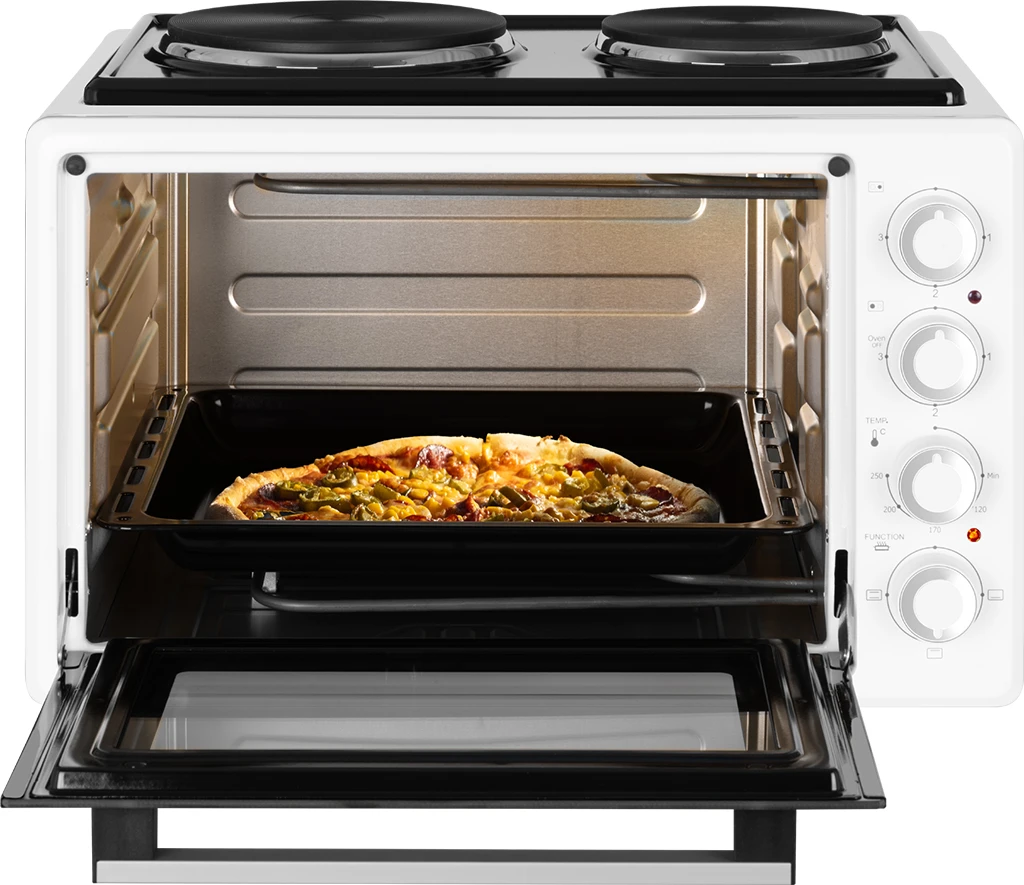 The tabletop oven with hotplates ECG ETH 3502W will please you with its high-quality glossy black metal design. The interior space is galvanized. The oven doors are equipped with double glass and three-phase opening for safer and more convenient handling. And there is also integrated lighting inside the oven, providing you with a great view of the dishes being prepared. Regular cleaning will contribute to extending the appliance's lifespan.