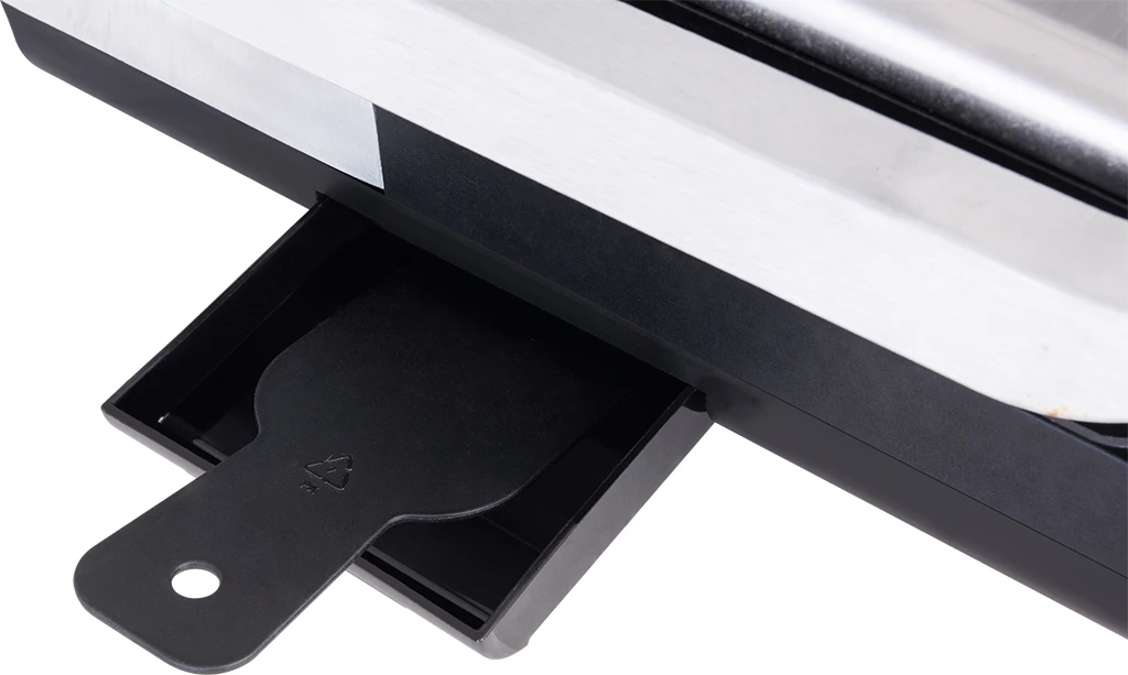 Who wants to clean their grill in a complicated and time-consuming way? Maintenance is not a problem with this model. The non-stick surface of the replaceable baking plates and the removable drip tray that catches excess fat, keeping the grill clean during and after grilling, are all taken care of. The package also includes a scraper that you can use to easily remove dirt. The size of the grill plates on this grill is 240 × 330 mm.