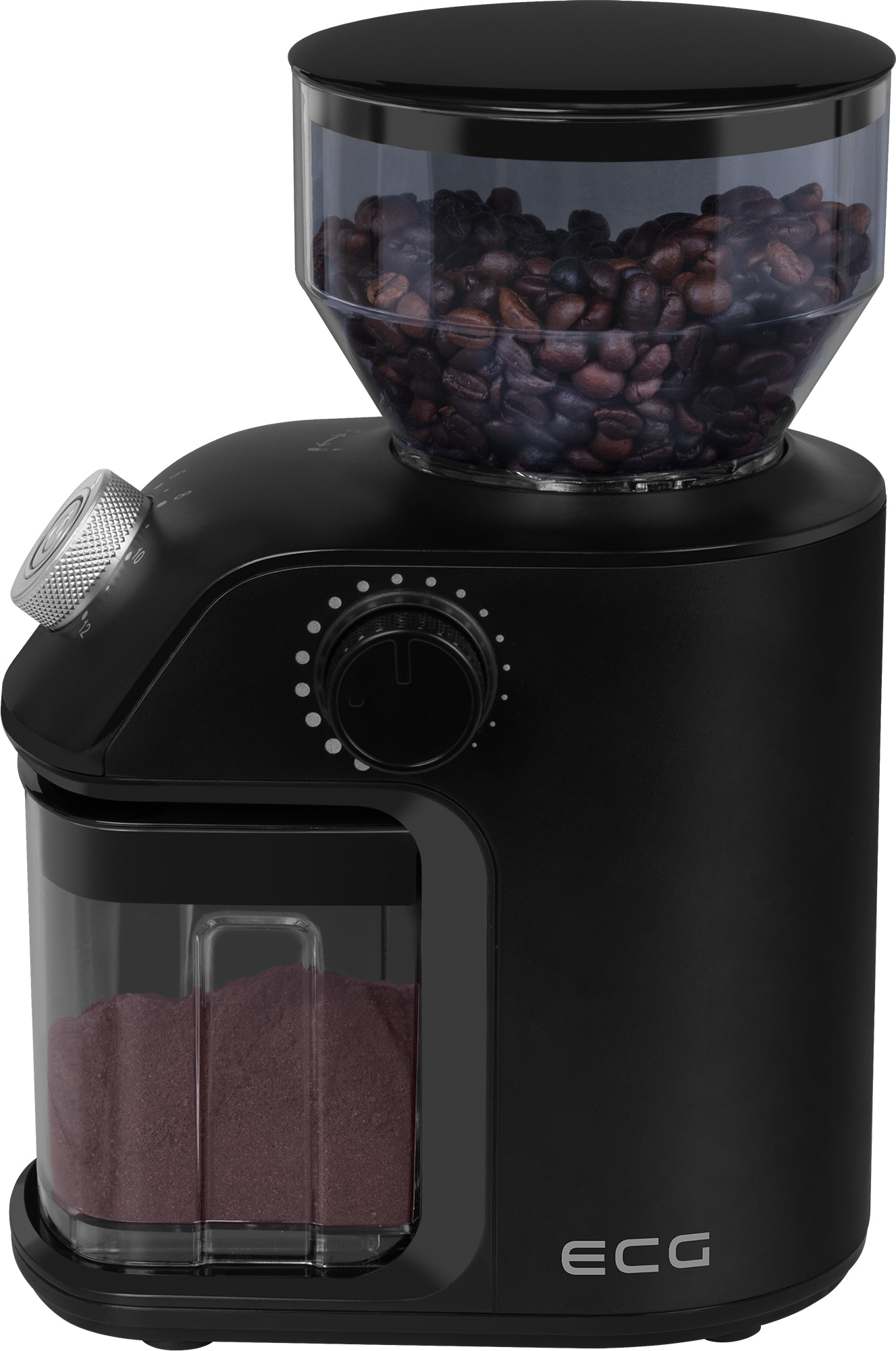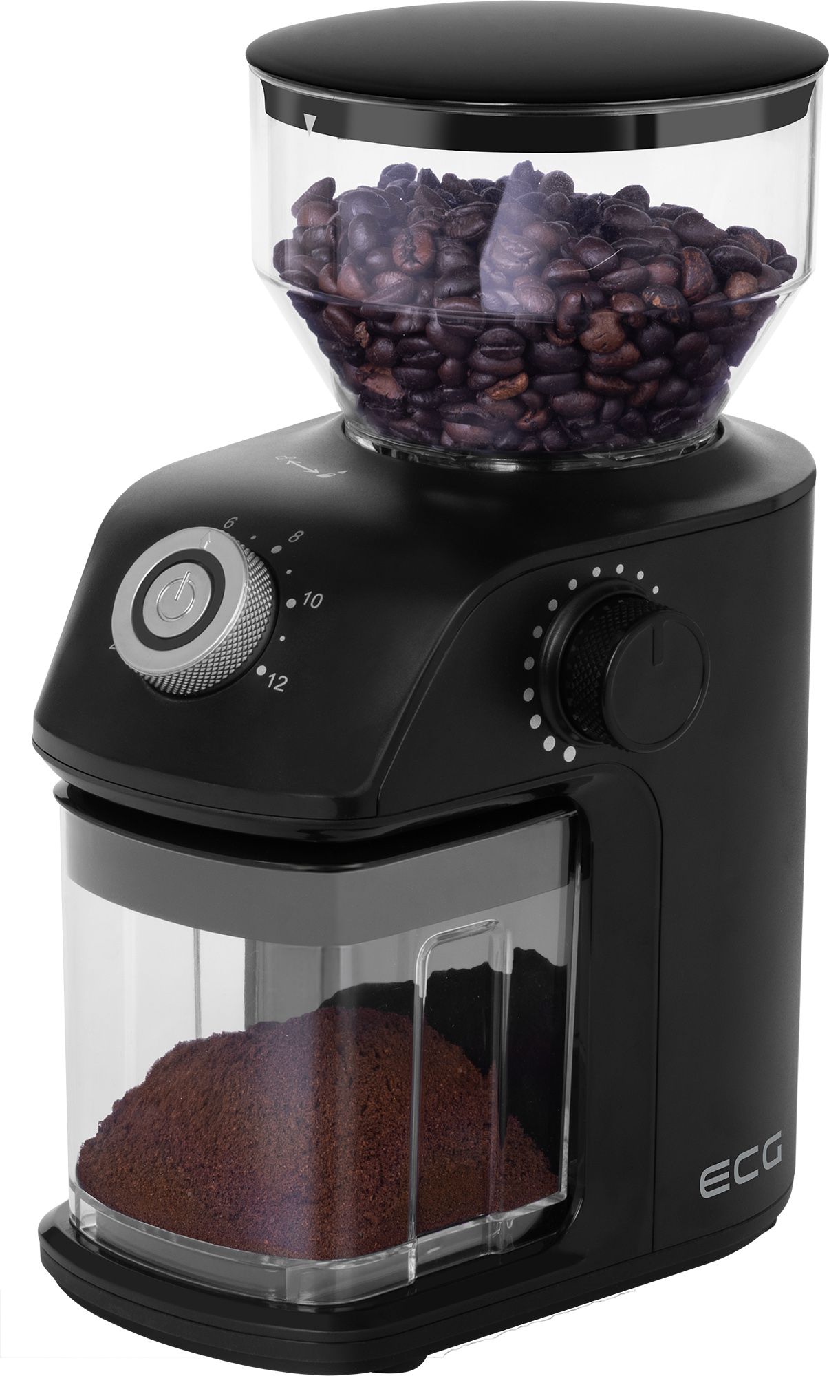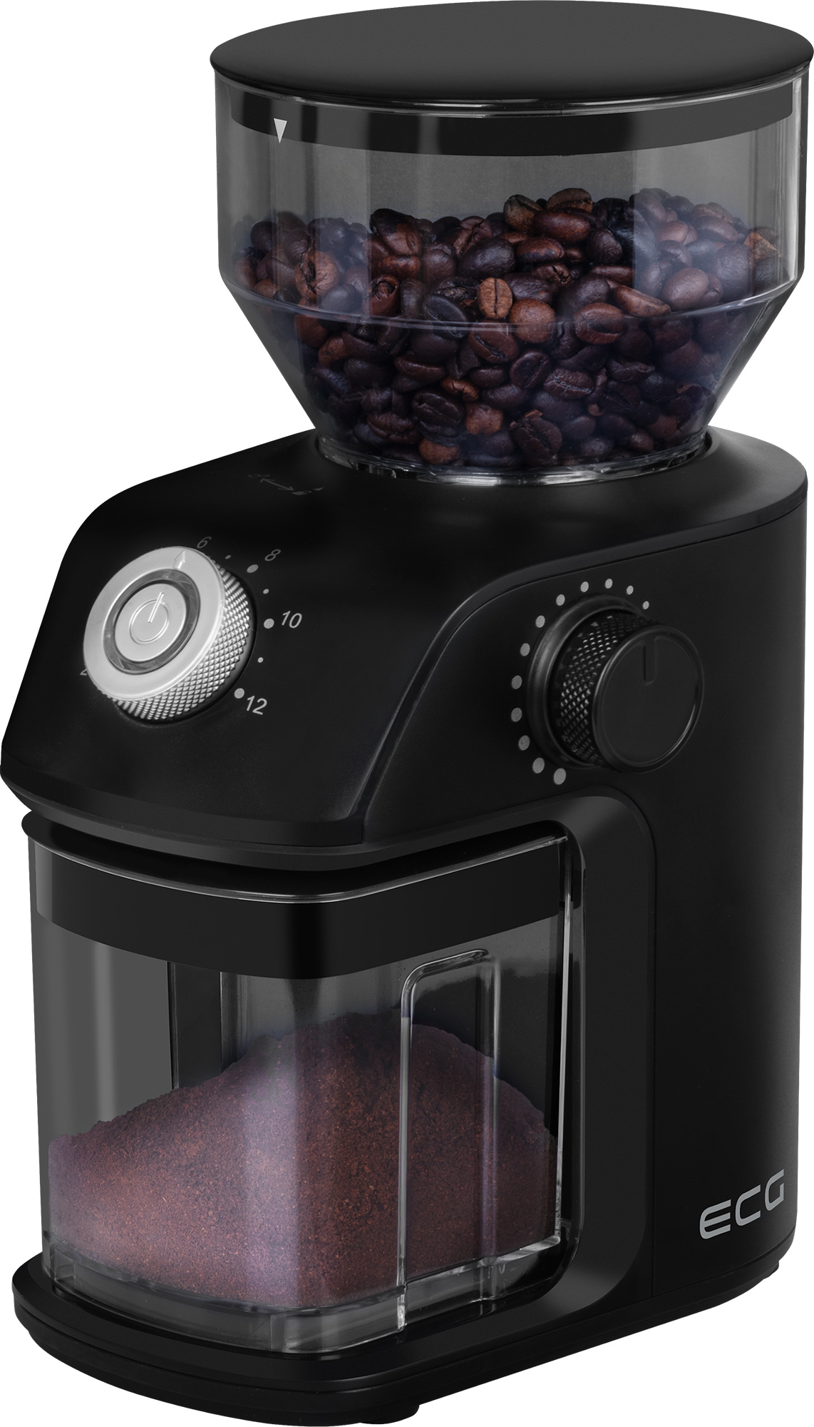 The ECG KM 1500 Medio grinder is extremely simple and intuitive to use. Just pour the beans into the hopper, select the grinding coarseness and number of cups, press the ON/OFF button and leave the rest to the grinder. The work only takes a few seconds, and once it is finished, the grinder automatically turns off (if you want to stop grinding earlier, just press the power button again).