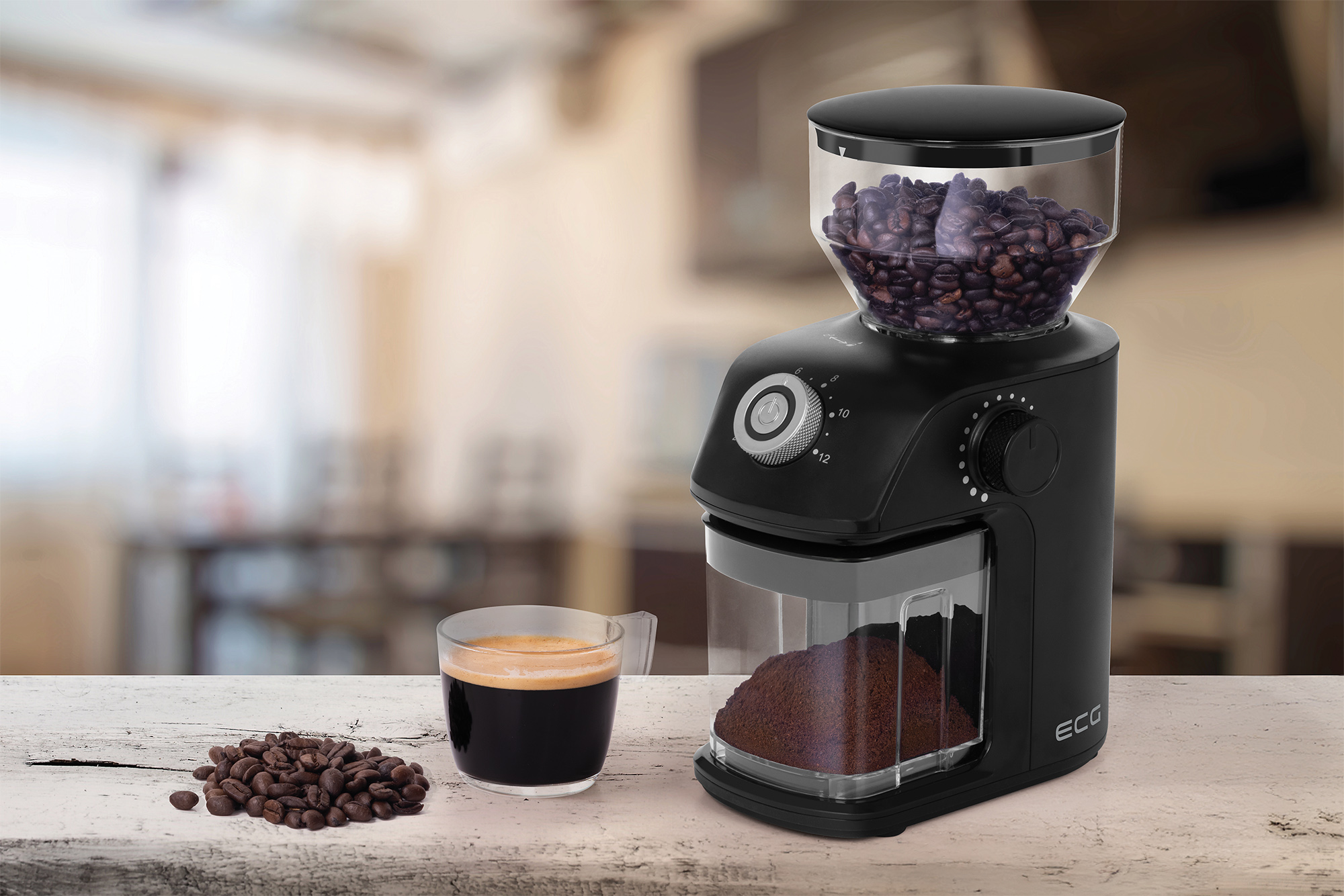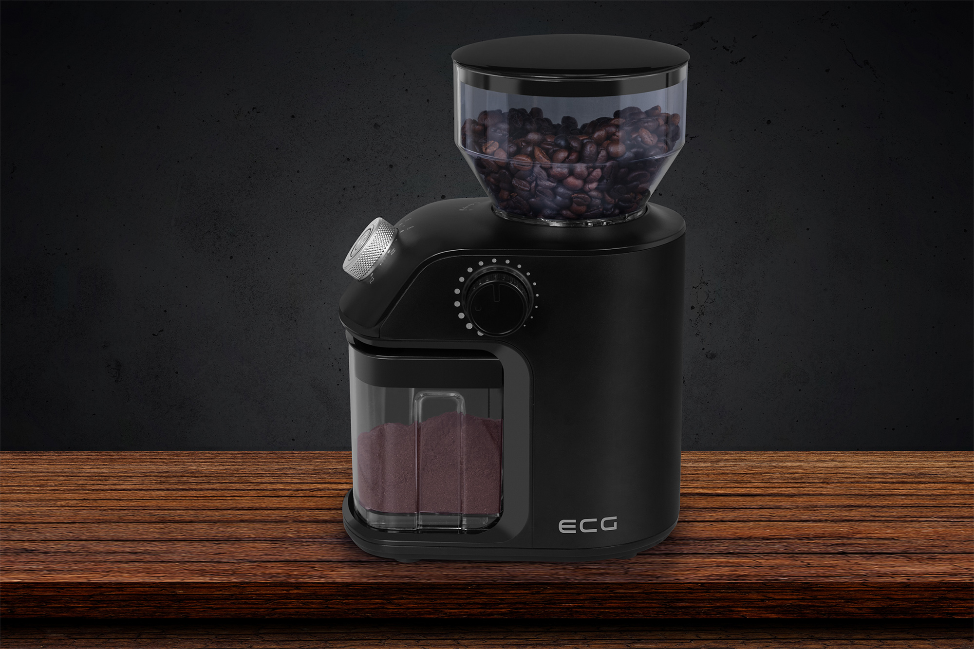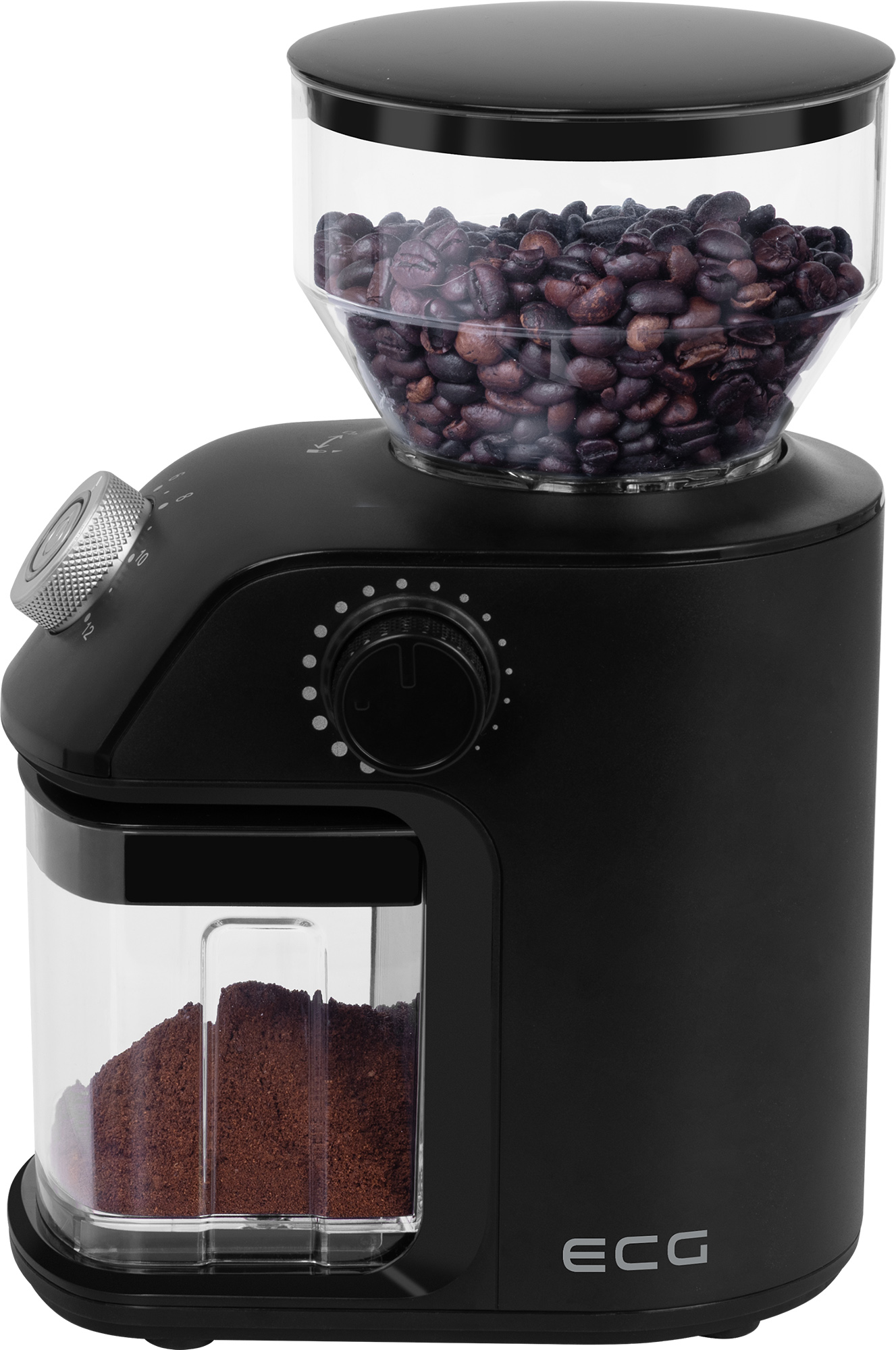The ECG KM 1500 Medio grinder is extremely simple and intuitive to use. Just pour the beans into the hopper, select the grinding coarseness and number of cups, press the ON/OFF button and leave the rest to the grinder. The work only takes a few seconds, and once it is finished, the grinder automatically turns off (if you want to stop grinding earlier, just press the power button again).
