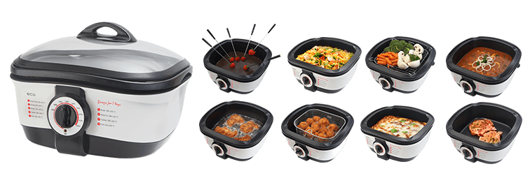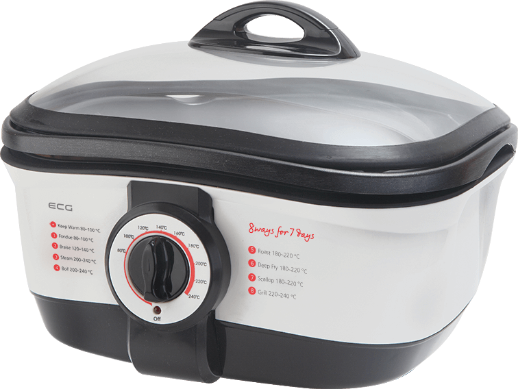 Cooking a luxurious lunch for a large family doesn't have to be the domain of renowned chefs. You can manage it easily using the ECG MH 158 multifunctional pot and without a pile of dirty pots, burned grease and dirty stove. You can cook a real delicacy in a fraction of the time using only one pot. You will save not only space in the kitchen, but also money that you would invest in several other appliances. The manufacturer got 8 of them in a single one!
