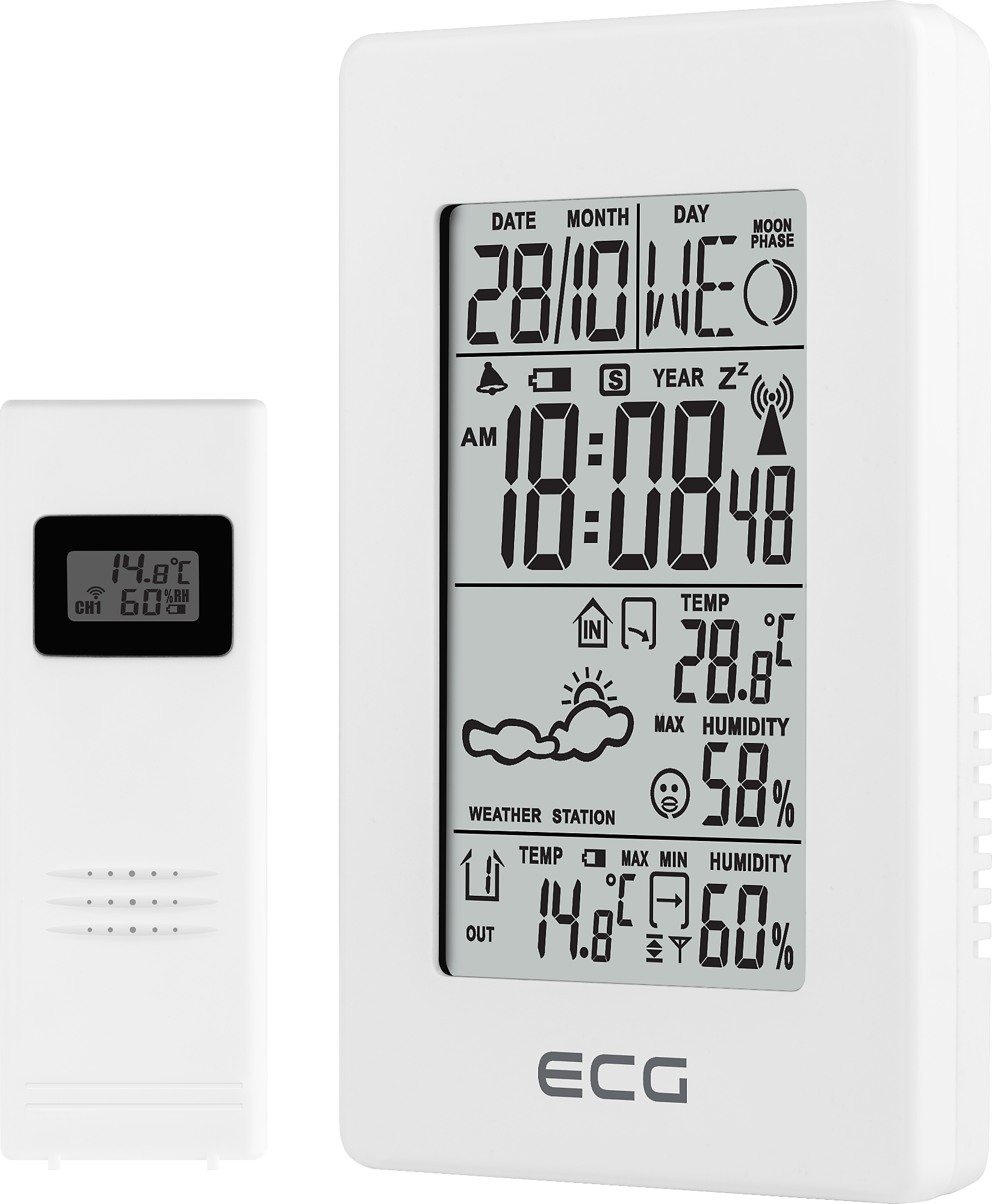 In addition to normal temperature data and information about the weather, the ECG MS 100 White weather station functions also as a clock (displays hours, minutes, seconds), alarm clock or calendar. The hours can be set in 12- or 24-hours format according to your preferences. You can also use the alarm clock, where the weather station also has 5 minutes snooze function. The display also shows the date. A bonus is the display of the Moon phase.