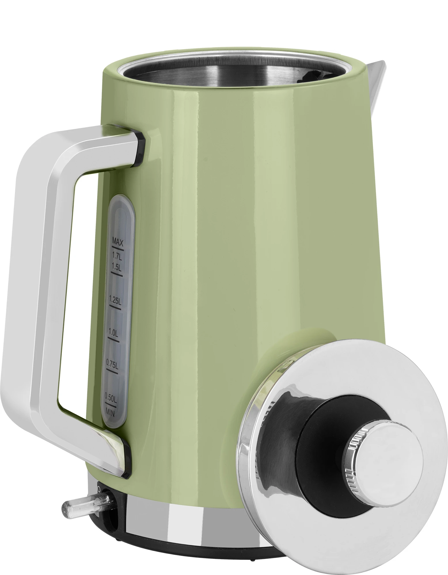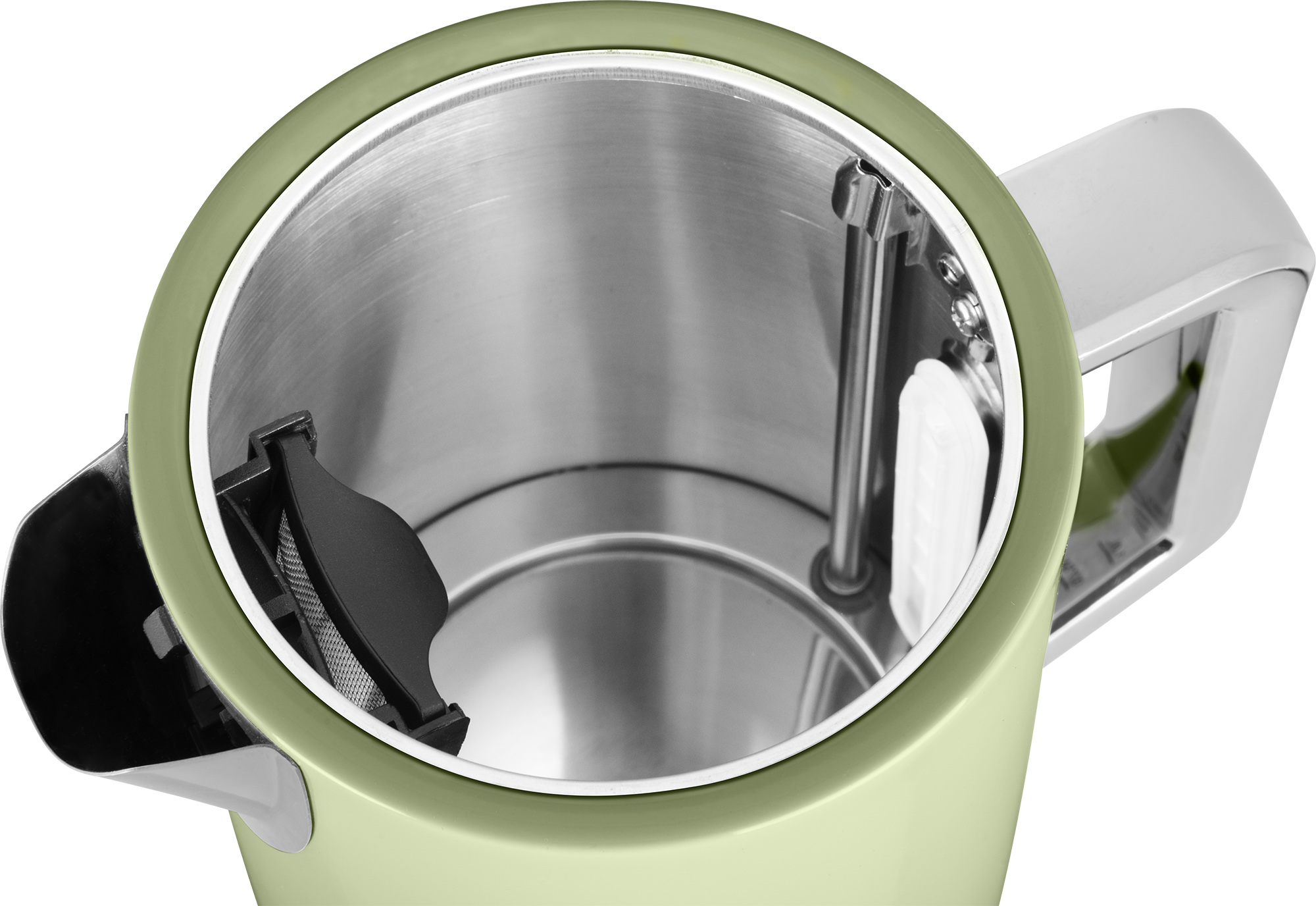 Get the ECG RK 1766 Vintage Olive kettle and you'll get a reliable helper for everyday tea and coffee preparation, as well as a tasteful kitchen decoration. We’ve designed this small appliance to catch your eye at first glance – we’ve given it a olive stainless-steel finish and accentuated its attractive appearance with stylish wooden elements.