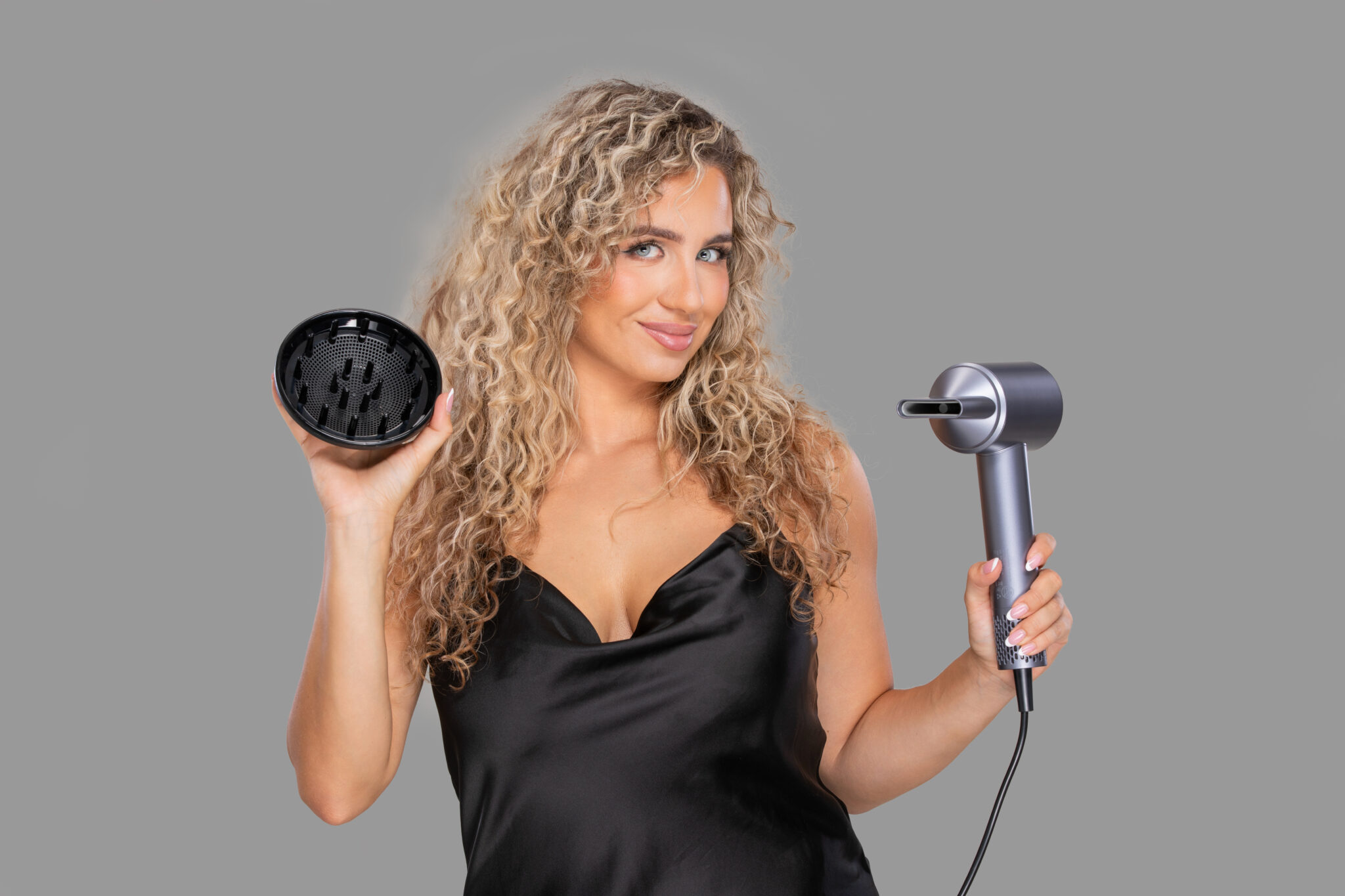 Magán a hajszárítón kívül a csomag tartalmaz egymágneses koncentrátort is, amelyet egyszerűen fel kell tenni, és így biztosítja a légáramlás pontos irányát – ideális a frizura részletes formázásához és formázásához. Emellett használhat egymágneses diffúzort is, amely segít gyorsabban szárítani a göndör és hullámos hajat anélkül, hogy elveszítené kedvenc fürtjeit. A hajszárító kényelmes és biztonságos használatát azergonómikus kalapács alaknak, kis súlyának, a tartós gumírozott szilikon tápkábelnek és esetlegtúlmelegedés elleni védelemnek köszönhetően biztosítja. A vezérlés intuitív, így a kevésbé tapasztalt felhasználók is könnyedén kezelhetik.