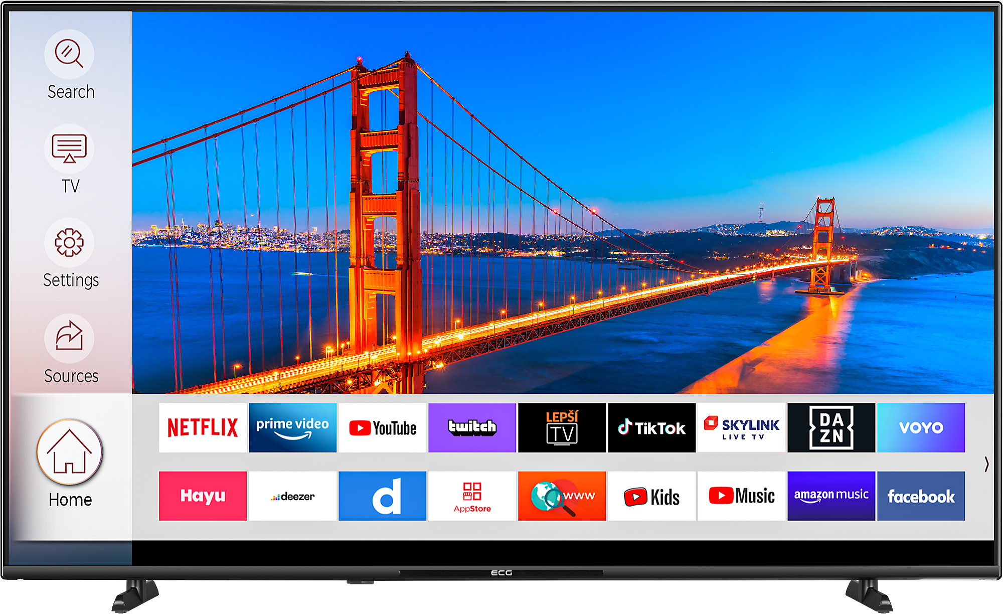 Popri možnosti sledovania klasických TV programov z pozemného vysielania, káblovky a satelitu (tunery DVB-T2/C/S2) vám televízor ECG 55USL231 otvorí bránu aj k množstvu ďalšej audiovizuálnej zábavy. Dá sa totiž pripojiť na internet (pomocou kábla a konektora LAN aj bezdrôtovo cez Wi-Fi) a je vybavený prehľadným operačným systémom Linux. Ten vás zavedie k celému radu moderných smart funkcií, z ktorých si to svoje vyberie každý člen vašej rodiny – k dispozícii tu máte množstvo populárnych aplikácií, vr. YouTube, Netflix či Amazon Prime Video.
