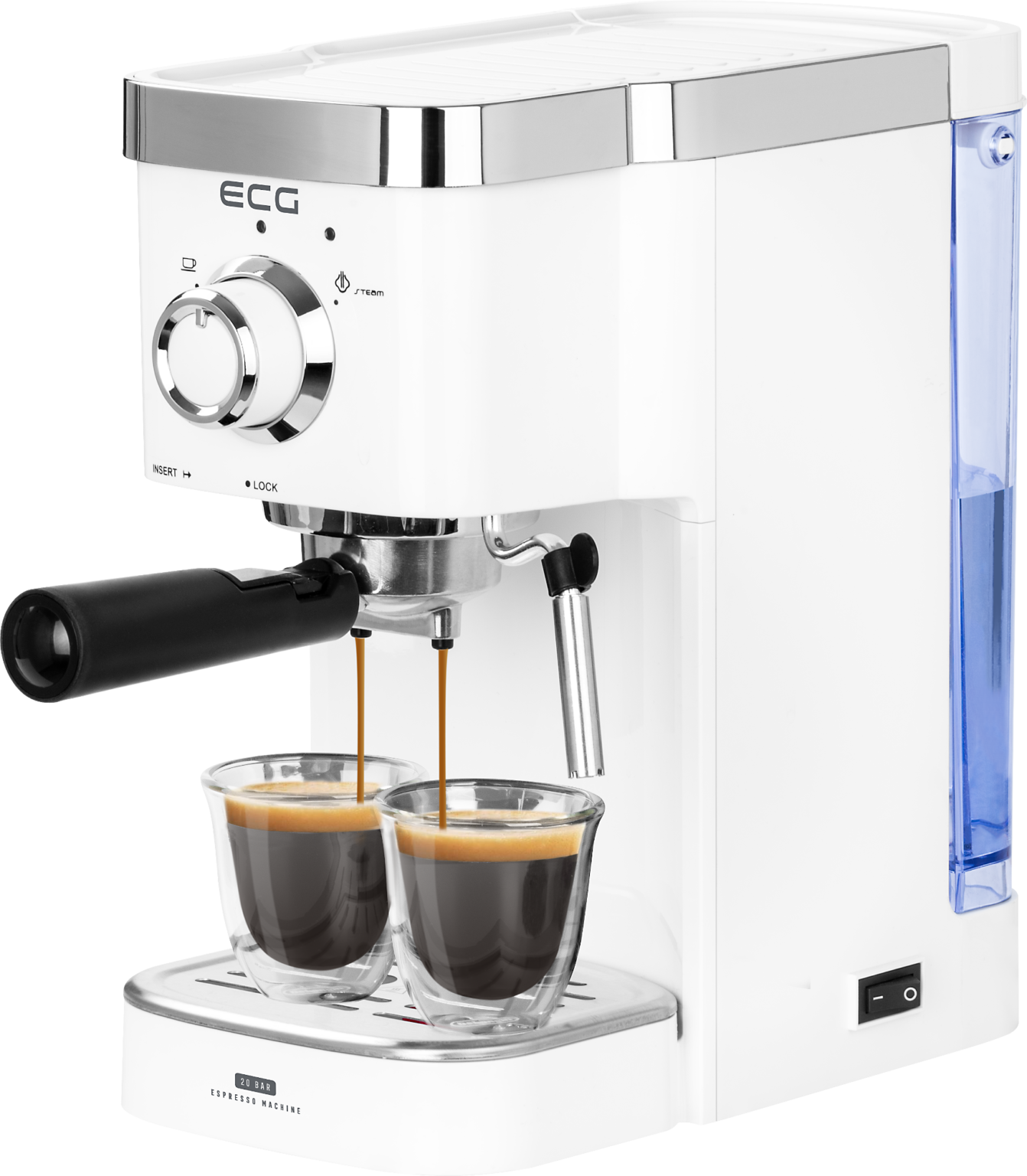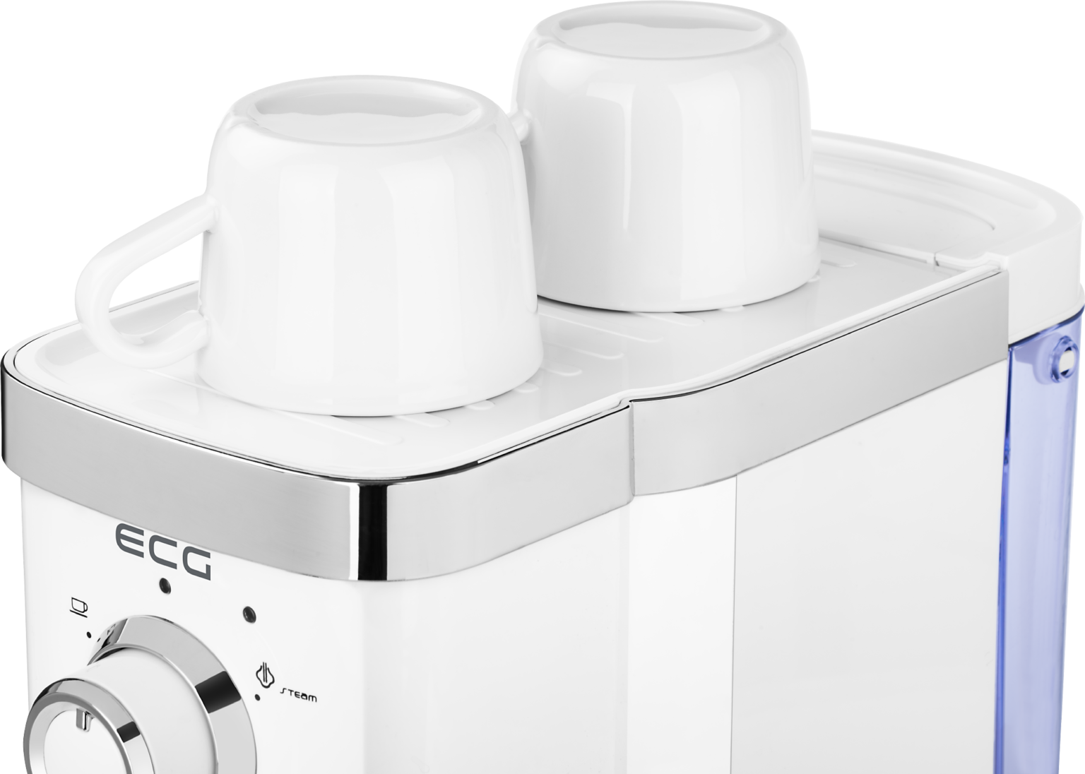 Na prvý pohľad vás kávovar ECG zaujme svojím čistým bielym dizajnom, s ktorým dokonale ladia chrómované prvky. Prednej časti dominuje hlavný otočný volič a takisto aj svetelné indikátory prevádzky. Tento model sa bude na vašej kuchynské linke skutočne vynímať.
