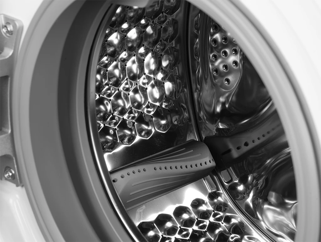 Dokonalú starostlivosť o vašu bielizeň zaisťuje aj špeciálne navrhnutý bubon Honey Comb. Jeho vnútorná stena je tvorená 655 šesťhrannými otvormi a svojím tvarom pripomína včelie plásty. Vďaka tomu sa minimalizuje opotrebenie tkanín počas prania, takže je vaše oblečenie chránené pred poškodením. Bubon je vyrobený z kvalitnej nerezovej ocele, ktorá odoláva vysokým teplotám a zabraňuje vzniku hrdze. Vďaka unikátnemu tvaru steny sa zvyšuje trecia sila a tým aj účinnosť prania – bielizeň je dôkladnejšie očistená bez toho, aby dochádzala k poškodeniu vlákien. Jemné odvodňovacie otvory s priemerom 2,5 mm navyše pomáhajú uzamknúť vlákna tkaniny a zaisťujú šetrné aj efektívne odstreďovanie.