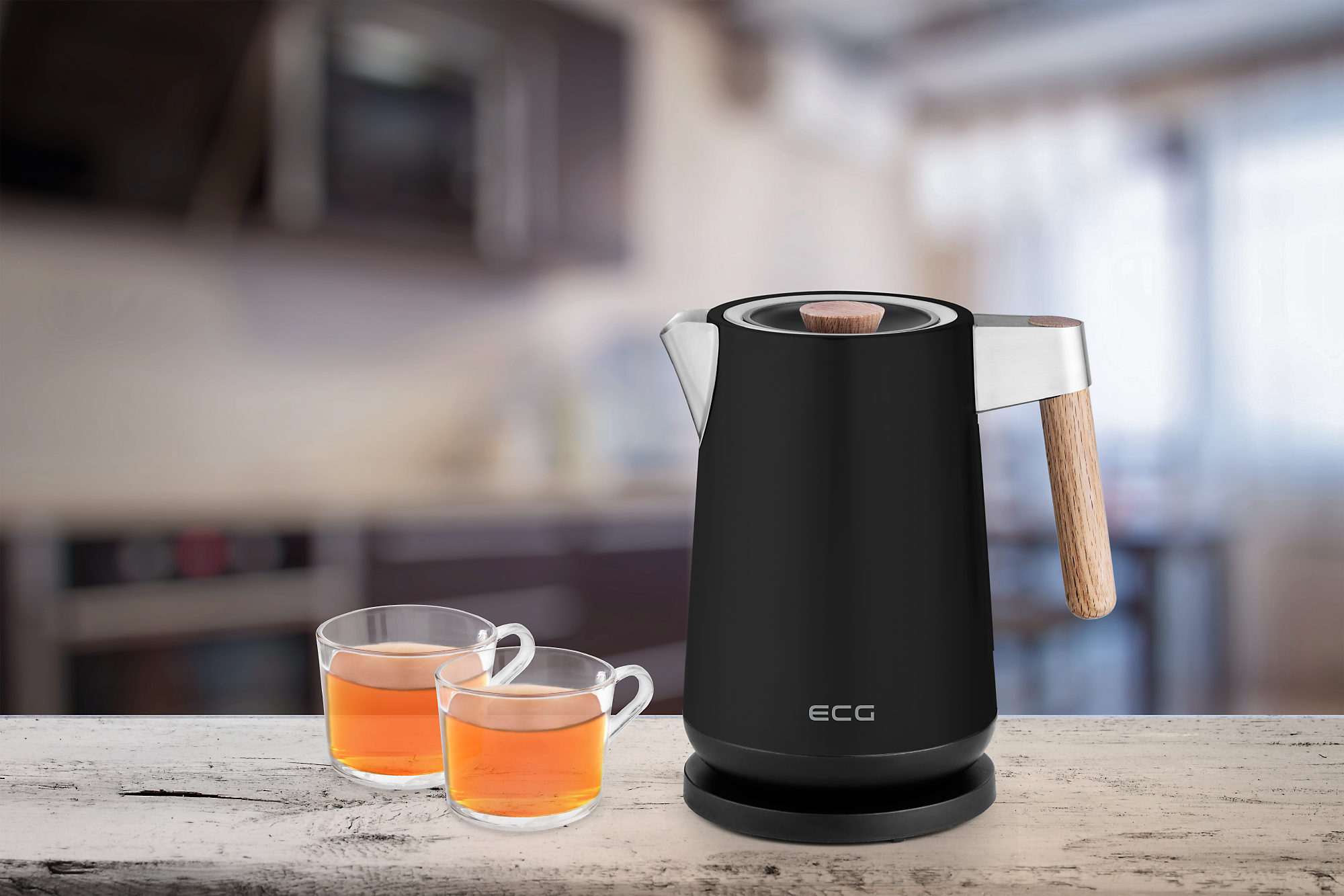 Kúpte si rýchlovarnú kanvicu ECG RK 1768 Strix Timber a získate nielen spoľahlivého pomocníka na každodennú prípravu čaju a kávy, ale aj vkusnú ozdobu kuchyne. Tento malý spotrebič sme totiž navrhli tak, aby vás zaujal hneď na prvý pohľad – opatrili sme ho čiernou povrchovou úpravou z antikora a jeho atraktívny vzhľad sme ešte podčiarkli štýlovými drevenými prvkami.