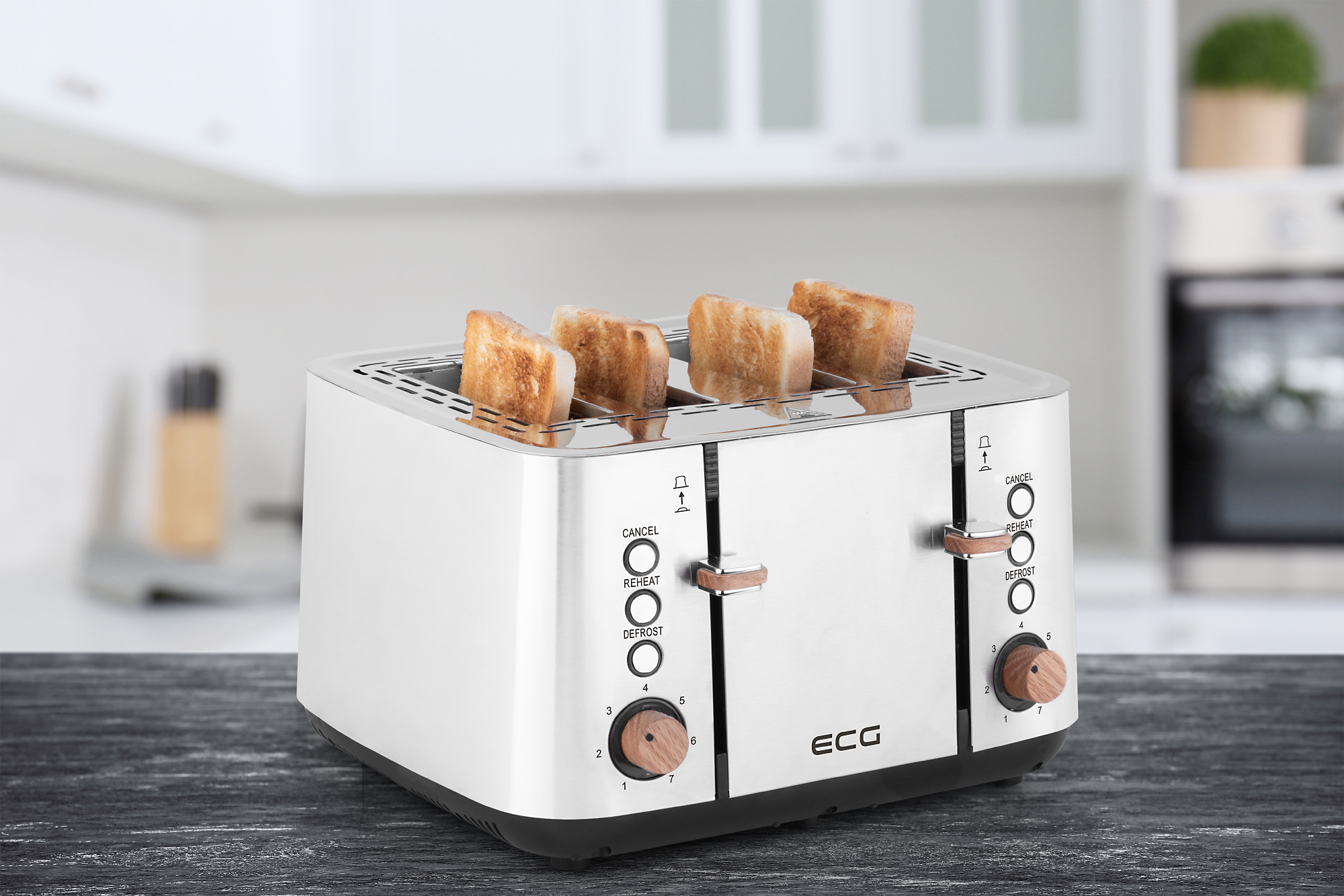 Pomocou dizajnového hriankovača ECG si môžete dennodenne pripravovať raňajky, desiate, olovranty alebo večere presne podľa svojich predstáv. Mieru opečenia si ľahko nastavíte prostredníctvom 7 stupňov intenzity ohrevu. Dopekanie pečiva je možné vďaka špeciálnej integrovanej mriežke. A aby toho nebolo málo, hriankovač ponúka aj praktické funkcie rozmrazovania a prihrievania. O rovnomerné opekanie sa pritom v každom prípade postará technológia automatického centrovania.