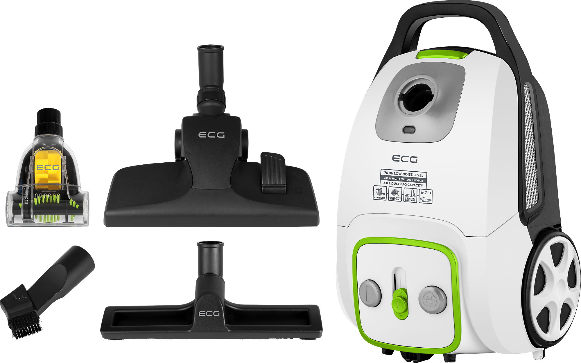V balení okrem samotného vysávača ECG VP S3010 a teleskopickej trubice nastaviteľnej na 54 – 92 cm nájdete aj praktické príslušenstvo. Nechýba tu podlahová hubica s výsuvnou kefou, parketová hubica s plastovým vlasom (PP) alebo 2 v 1 kombinovaná zúžená hubica a prachová kefa. Majitelia domácich maznáčikov iste uvítajú mini PET turbo kefu.