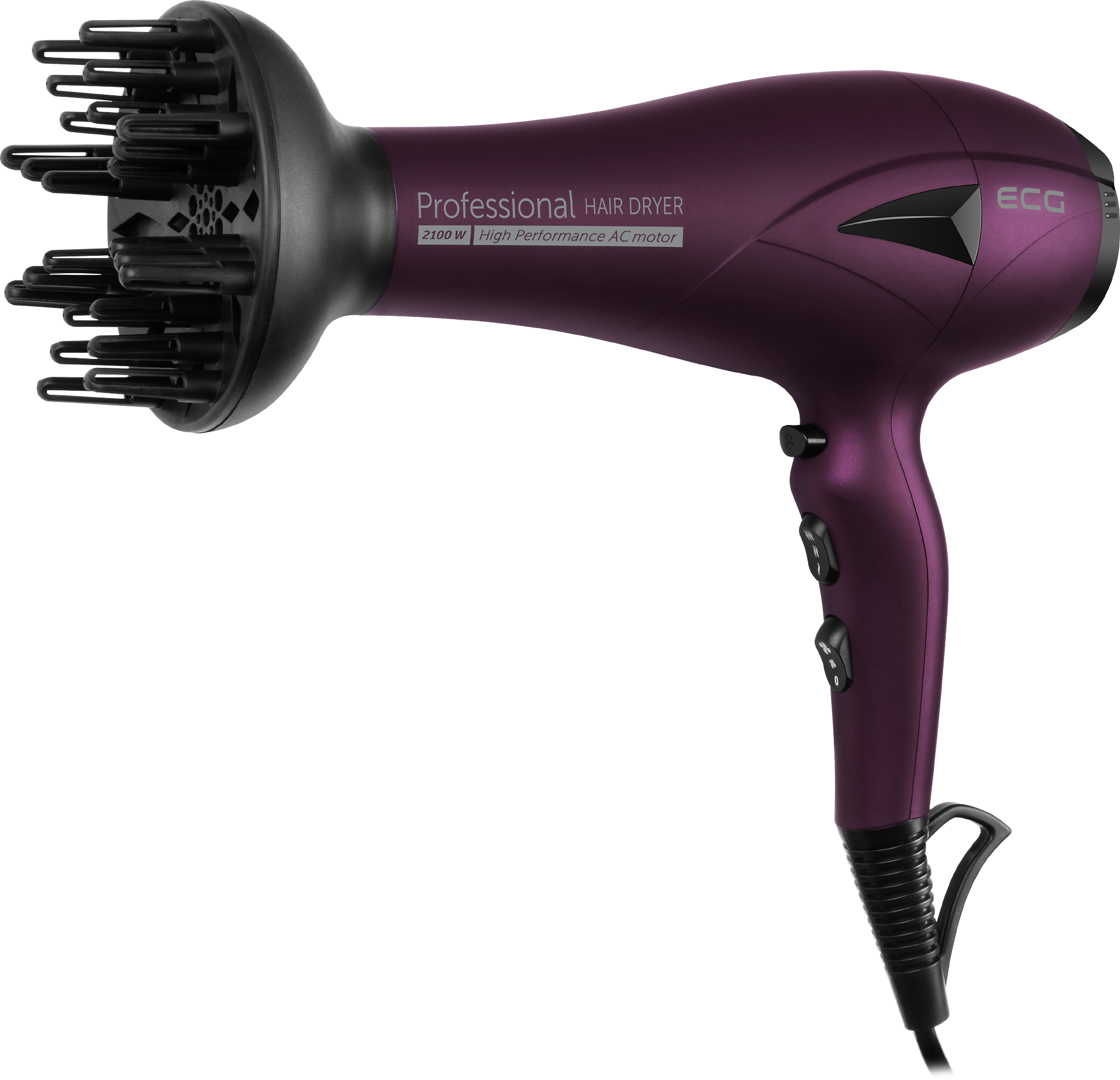 Sušič vlasov ECG VV 3121 Professional vo fialovom vyhotovení dokonale vynikne v každej kúpeľni. S výkonom dosahujúcim hodnotu 2100 W sú rýchle vysušené vlasy samozrejmosťou a vy jednoducho docielite profesionálne výsledky.
