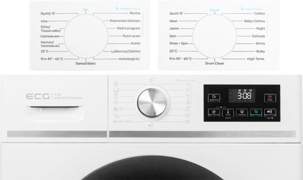 ECG EWS 60120 iSteam je cenovno ugoden pralni stroj s klasičnim sprednjim polnjenjem, ki vas bo navdušil s svojim modernim dizajnom, preprostim upravljanjem z razumljivimi ikonami in naprednimi tehnologijami za popolno nego vaših oblačil. Med njimi še posebej izstopa funkcija Predpranje s paro za čisto, sveže in higiensko obdelano perilo, ki je hkrati prijetno mehko in zaščiteno pred obrabo. Z zanesljivim BLDC motorjem, vhodno močjo 1900 W in kapaciteto 6 kg ta pralni stroj ponuja popolno razmerje med zmogljivostjo, prostorom in varčnim delovanjem (uvrščen je v energijski razred A). Zahvaljujoč hitrosti ožemanja do 1200 vrtljajev na minuto lahko računate tudi na krajši čas ožemanja. In da lahko z njim na visoki ravni poskrbite za različne vrste tkanin, vam je na voljo 16 različnih programov. Paket vsebuje tudi nalepke s češkimi in angleškimi nalepkami. Da bo pralni stroj v optimalnem stanju, lahko uporabite praktičen samočistilni program.