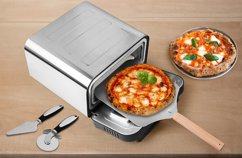 Ste ljubitelj pristne italijanske pice in bi radi to dobroto pripravili na visokem nivoju v udobju svojega doma? Potem je ECG FORZA 4500 Pizza naprava točno za vas. Ta kompaktna pečica za pico dvigne domačo pripravo popolne hrustljave pice na profesionalni nivo. Zahvaljujoč temperaturi do 450 °C, kakovostnemu pekaču in premišljenim funkcijam poskrbi za popolno pečeno testo v rekordnem času, hkrati pa vas razveseli z varnim in varčnim delovanjem ter preprostim upravljanjem. Skratka, s to pico lahko kadarkoli uživate v okusni pici, pripravljeni točno po vaših željah. Tudi Elegantna kovinska oblika pečice bo stilsko dopolnila vsak interier, od moderne do rustikalne kuhinje.
