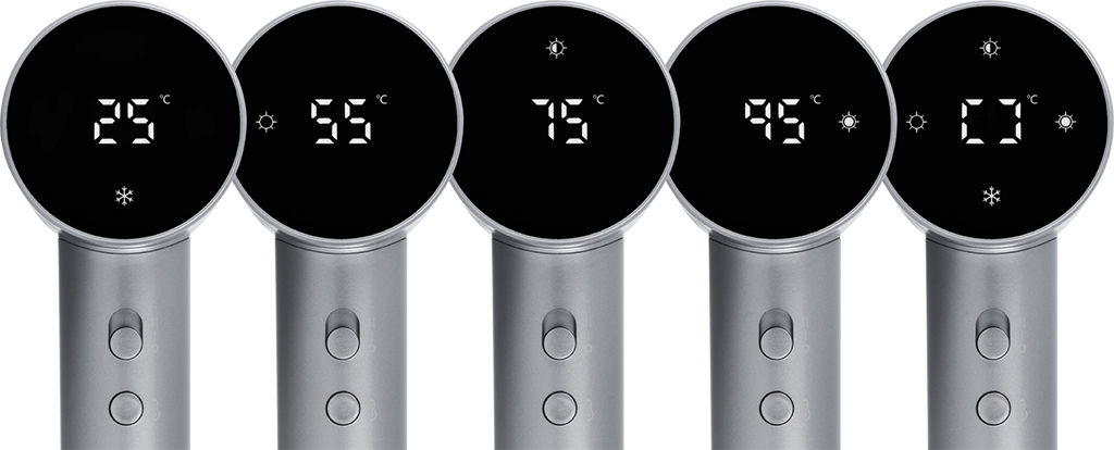 Sušilo za kosu ECG Modifica Sonica Moonstone nudi četiri temperaturna načina – od hladnog zraka za finu i osjetljivu kosu do ekstra toplog načina rada za gušću kosu. Praktičan je i program pametnog ciklusa koji izmjenjuje temperature za maksimalno nježno i ravnomjerno sušenje. Kako biste mogli precizno prilagoditi sušenje svojim potrebama ili tipu kose, na raspolaganju su vam i dvije brzine strujanja zraka. Moderan digitalni zaslon u suradnji s elegantnim LED indikatorom temperature u boji koji ima oblik kružnog prstena, informira vas o trenutnoj postavci.